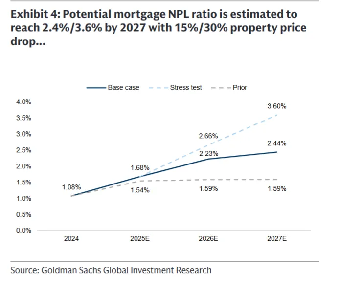 研报用双情景测算损失(图表2,研报P3):基础情景是2026-27年房价跌15%,压力情景跌30%。图表清晰显示,2024年12月房价指数为100,基础情景下2027年跌至85,压力情景跌至70,较此前4%的跌幅预测大幅下调,但银行扛得住。