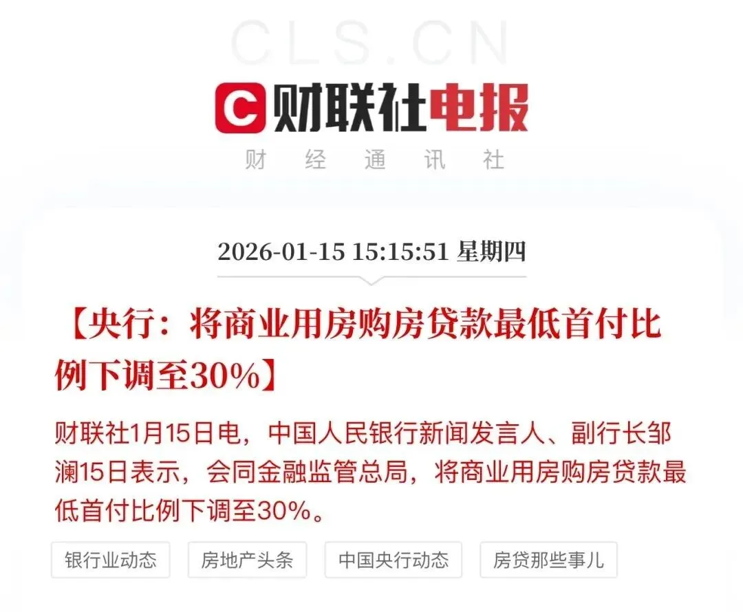 2026年1月15日,中国人民银行发布了一项针对商业地产市场的重磅金融政策。中国人民银行新闻发言人、副行长邹澜在新闻发布会上明确,央行将会同金融监管总局,将商业用房购房贷款的最低首付比例下调至30%。此次调整标志着商业地产信贷门槛的显著降低。