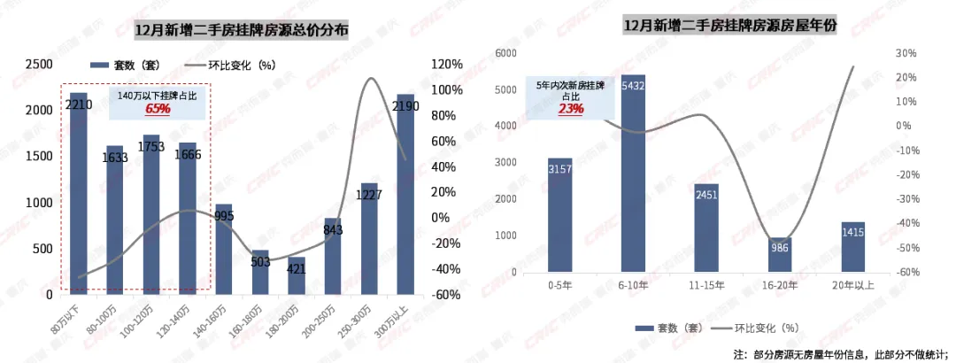 房龄分布:近5年房龄的“次新房”占比下降6个百分点,次新房源挂牌放缓,业主"持房观望";