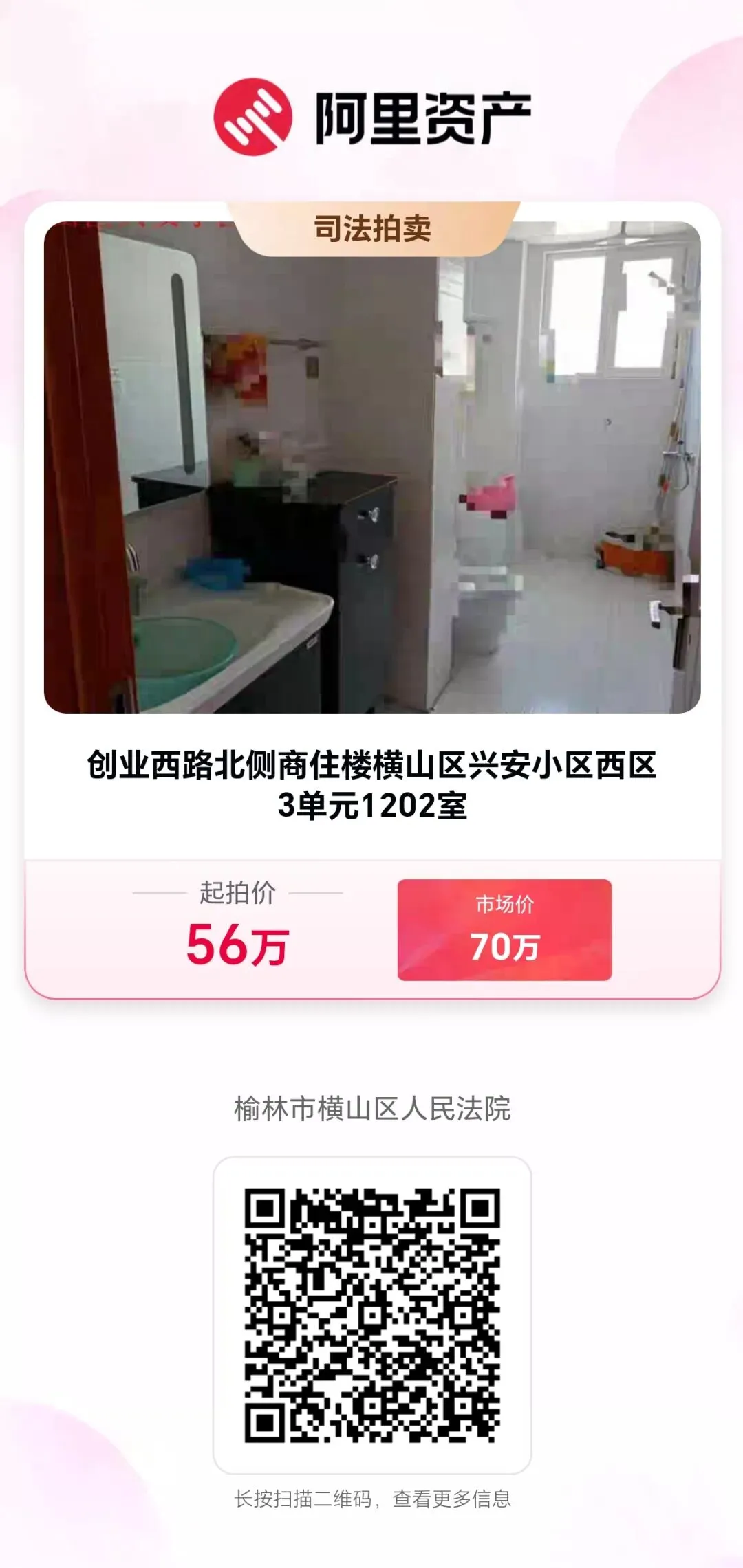 1月30日10时至31日10时,横山法院将在淘宝网司法拍卖平台上,拍卖横山区兴安小区西区房产,56万元起拍!