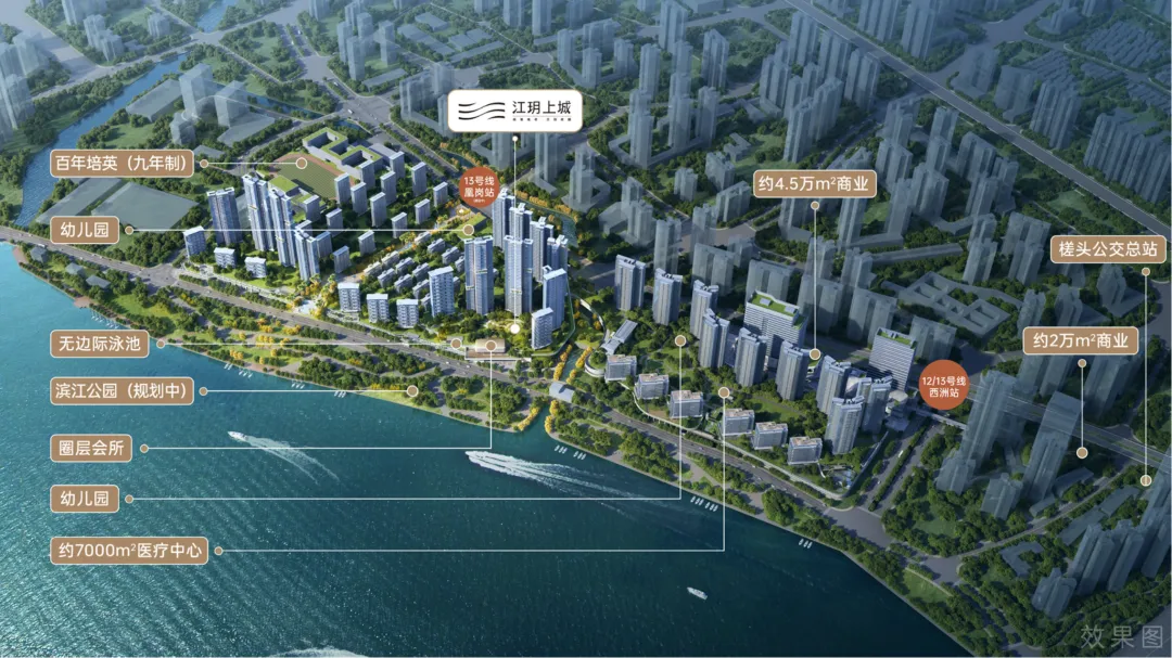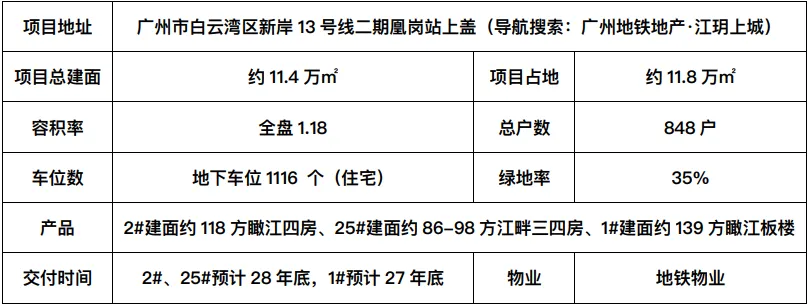【三地铁交汇】12/13/8 号线,30 分钟贯通越秀、天河 CBD,2 站直达⽩云站 TOD 1)12 号线⻄洲站(已通⻋),2 站直达⽩云站(亚洲最⼤综合交通枢纽),1 ⼩时直达湾区核⼼城市; 2)13 号线⼆期凰岗站上盖(预计 2026 年通⻋),专属地铁归家通道,出⾏更安全舒适 3)佛⼭ 8 号线(规划中),⽆缝衔接⼴佛; 【全维⼤城配套】约 150 万⽅ TOD ⼤城,集居住、教育、商业、轨道交通于⼀体。 1)省⼀级百年培英中学(54 班九年制)已签约+15 班幼⼉园。 2)家⻔⼝规划 13 ⼤滨江公园绿洲(湿地公园、⽂化⼴场)+约 20km 滨⽔绿带。 3)近享 7000 ㎡社区医疗中⼼(规划)+约 6.5 万㎡缤纷商业+⾃带约 2000 ㎡观江会所,配置⽆边泳池、健身房等。【江岸产品,再⽴潮头】 【2#建⾯约 118 ⽅瞰江板楼】颠覆江景改善尺度,不到 120 ⽅的⾯积,同时享受⼀线观江视野、地铁归家通 道、百年培英教育等全维配套,全市难寻的⼀步到位改善选择。2 梯 3 户,全南瞰江,四房两厅两卫。 1)建⾯约 118 ⽅(01/02 为镜像户型):约 6.9 ⽶奢阔开间,全南约 20 ⽶五⾯观江。 2)建⾯约 118 ⽅(03 户):约 13.55 ⽶观江⾯,江园双景致主套。 【25#建⾯约 86-98 ⽅江畔三四房】超配进阶的理想居所,轻松享受全维丰盛配套。建⾯约 98 ⽅(01 户):园⼼四房两卫,头排正席瞰园,超 13 ⽶南向采光。建⾯约 97 ⽅(02 户):对流单边四房两卫,超 13 ⽶南向采光,全景观园。 建⾯约 86 ⽅(03/04 户):单边南北对流三房两卫,超 10 ⽶南向采光。 三地铁交汇,54 班九年制培英学校,下楼即享江⻛绿氧+约 6.5 万⽅商业。