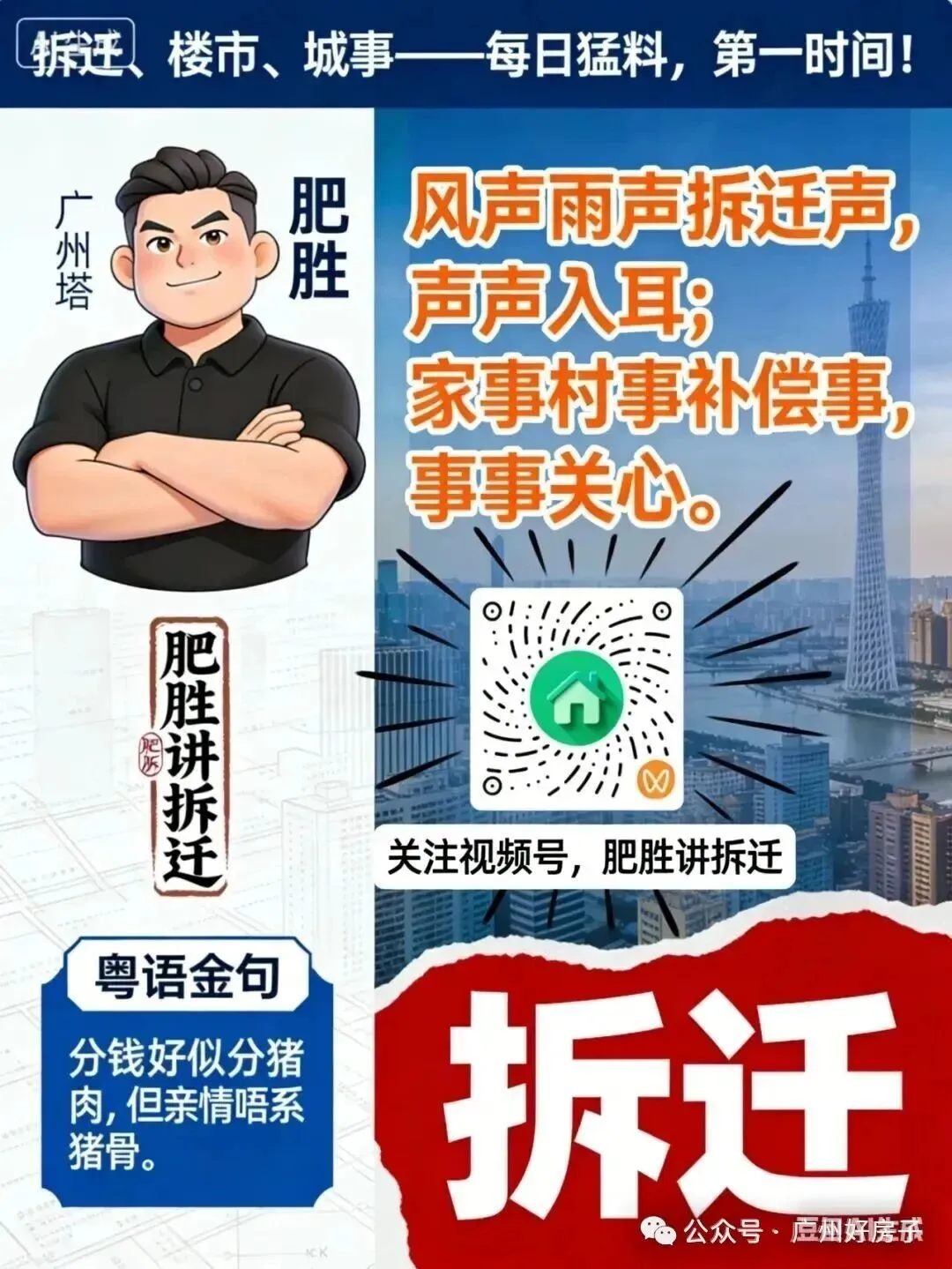 老广街坊饮早茶必备·拆迁快报!(AI辅助粤语创作·街坊至啱key)每日晨早七点半准时推送,阿胜用最地道粤语同你讲透广州拆迁动态!边度征拆、补偿点计、点样回迁——实况第一时间话你知!跟实「广州好房子」,拆迁富到流油!买楼掂过碌蔗!