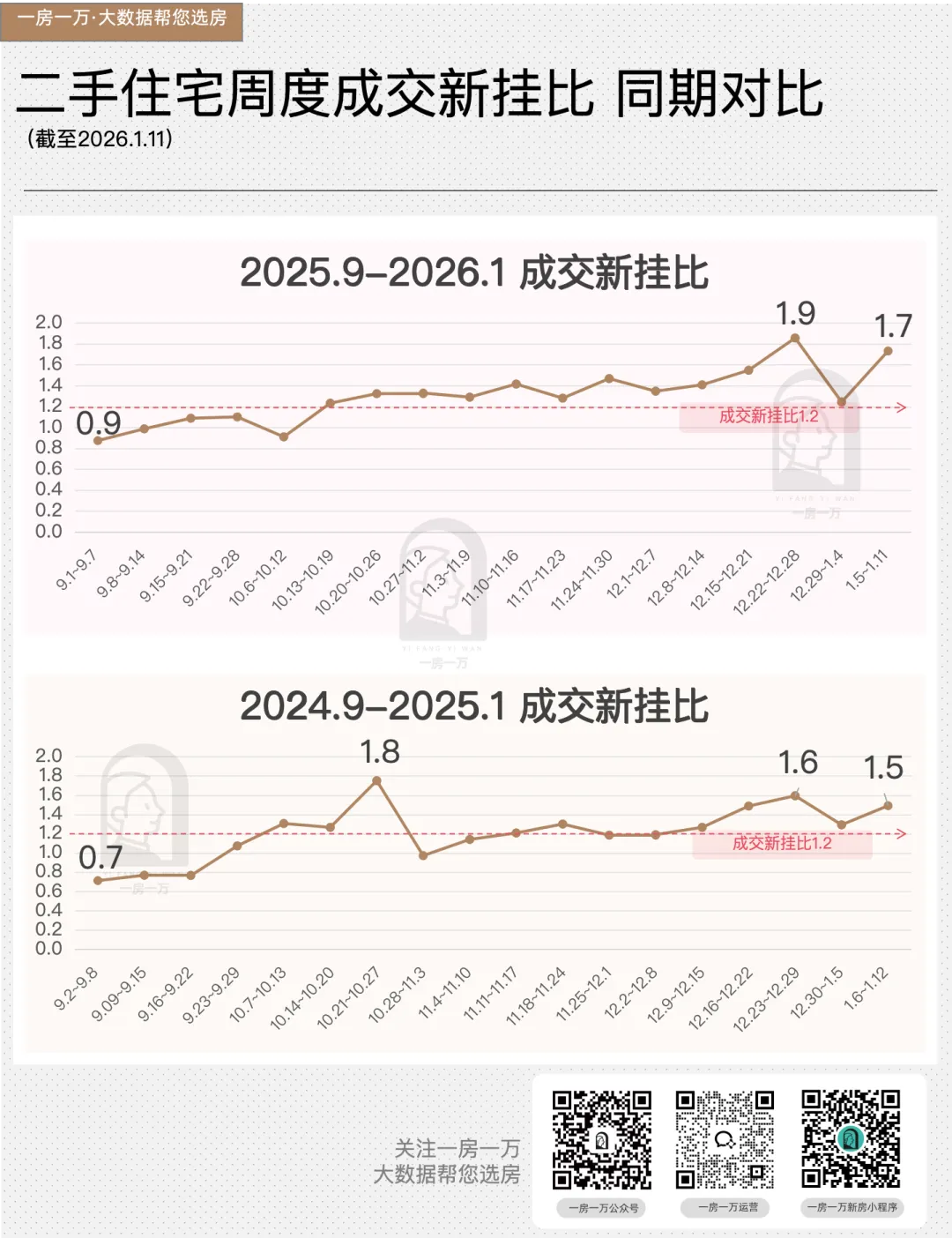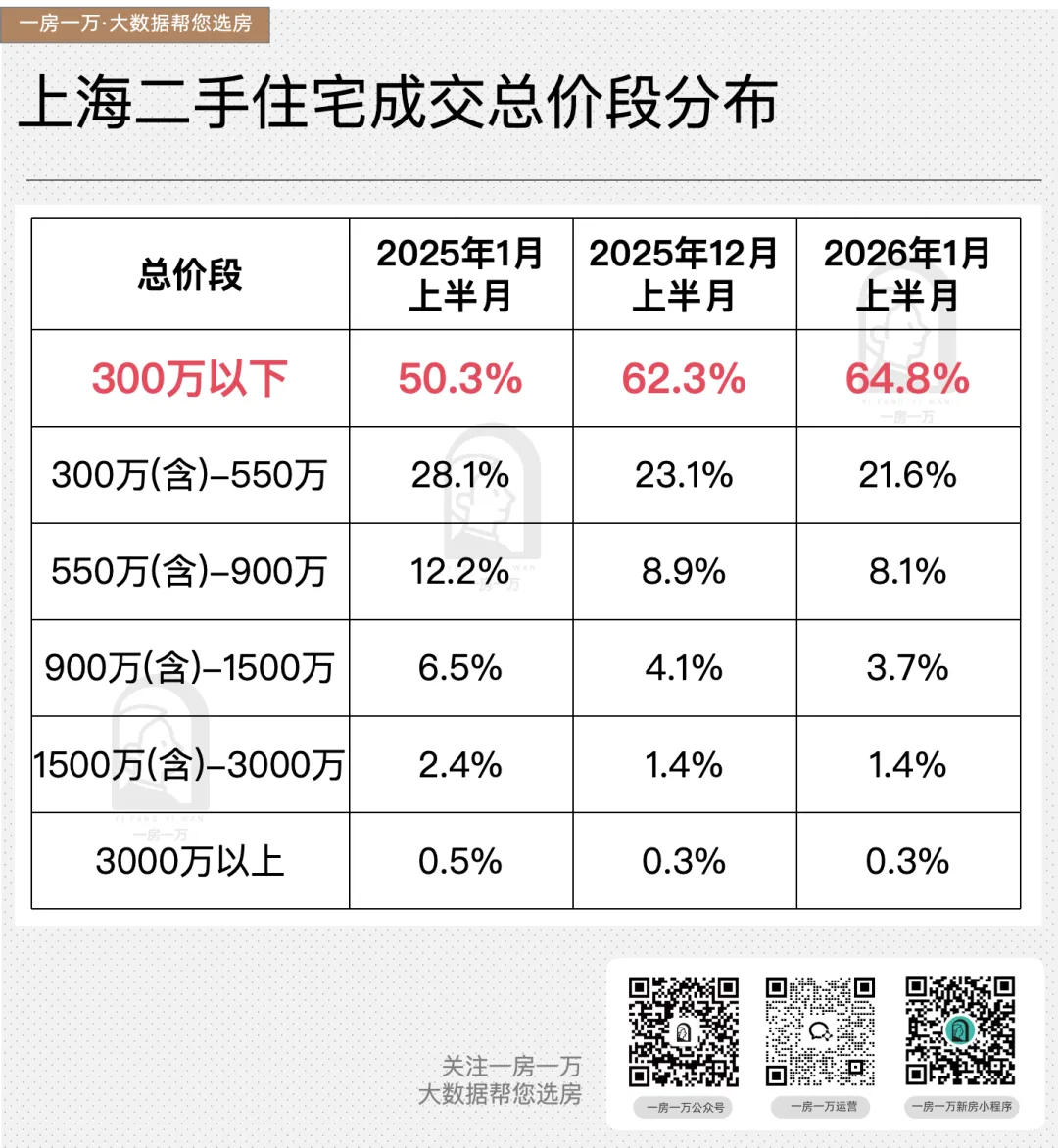 对比近五年同期的二手房成交量,今年1月份上半月成交9135套,位列TOP2,仅次于2025年同期。2025年的放量,是因为2024年9.29新政的带动;而今年1月份在没有强政策的刺激下,延续了年底“翘尾”行情,实属不易。上海二手房正在经历居住需求的自然释放,内部结构也在悄然调整。好多人(尤其是外地的小伙伴)都觉得,近段时间上海的二手市场好像突然间变得更加活跃了。我们对比半月度的总价段成交结构,无论是环比还是同比,当下低总价刚需的成交占比,都在强势提升。1月上半月,300万以下占比已经上升到了64.8%。就是在当下,内环内有大量的老旧小,以及郊区的远大新,因为价格跌出了性价比,正在吸引刚需上车。永远不要低估这种生生不息的力量——它正在看不见的地方,悄悄夯实市场的基底。也许当下你还看不出刚需筑底的迹象,但是想不到哪一天,卖了两三百万的老破小or远大新的伙伴,可能就去买新房或者更高段位的二手房了。这位伙伴,可能会是你的同事,你的朋友,当然也有可能是你自己。更值得关注的是供求关系,从2025年10月中旬过后,上海二手房的周度成交新挂比就一直高于1.2了。也许你会说,这是因为快到年底了,很多潜在卖房房东暂缓挂牌,要等到开春后才进场。但是我们同步去对比去年同期,还是可以明显地感受到,今年年底的这波成交能量,的确有些不一样——如果接下来能够延续这种稳定的势头,上海二手房的挂牌库存,还有望进一步下探。被头部中介隐藏的成交数据找回来了!