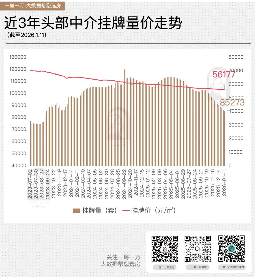 截至2026.1.11当周,头部中介挂牌量约8.5万套,较上月底(8.8万套)下跌了约3%。挂牌价格方面,当下挂牌均价约56177元/㎡,较上月底(56157元/㎡)上升了约0.04%。肉眼可见,头部中介挂牌量从去年小阳春后持续下滑,已经追平至2023年年底。