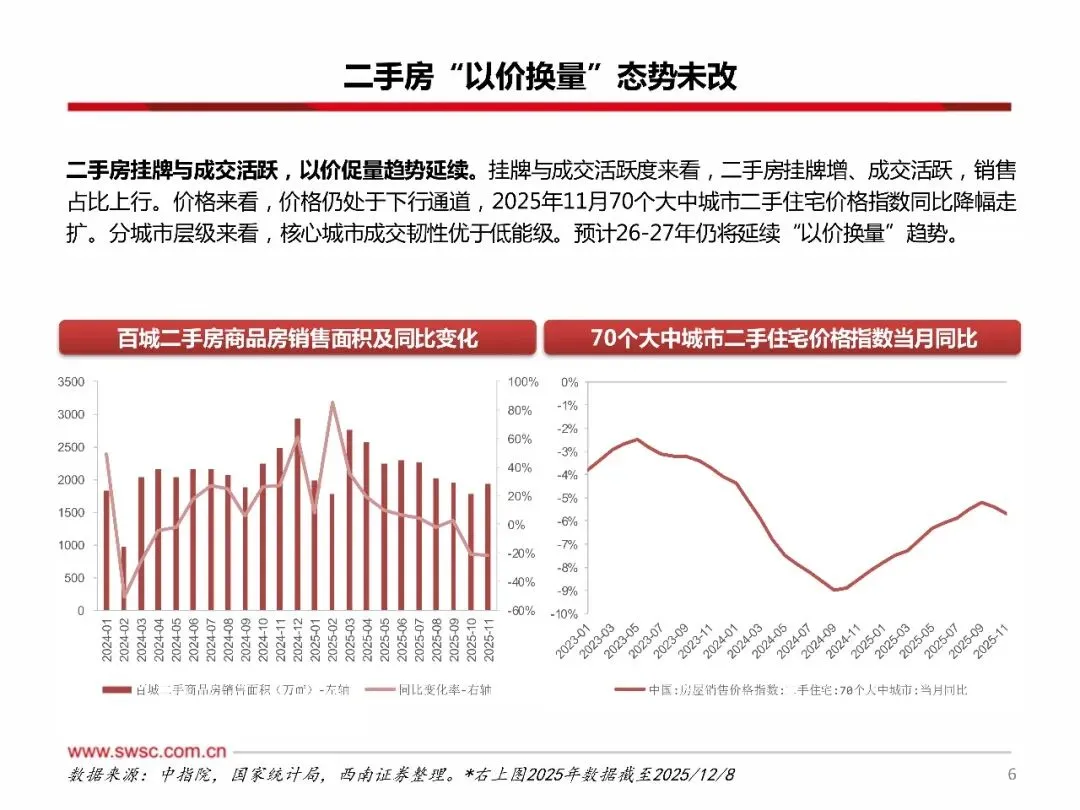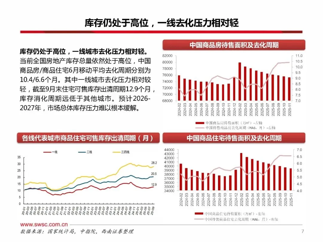 基本面:新房销售仍处收缩区间,2025年1-11月新建商品房销售面积同比-7.8%,新建商品住宅销售面积同比-8.1%,70城新建住宅价格降幅收窄。城市分化加剧,一线相对韧性。二手房“以价换量”态势未改。库存仍处于高位,一线去化压力相对轻。新开工与竣工收缩明显,新增供给意愿与能力同步走弱。土地市场成交“缩量提质”。施工面积下行与购置费负增拖累,房地产开发投资持续承压。政策以“止跌回稳”为目标,推进“好房子”建设。预计2026市场将延续筑底。