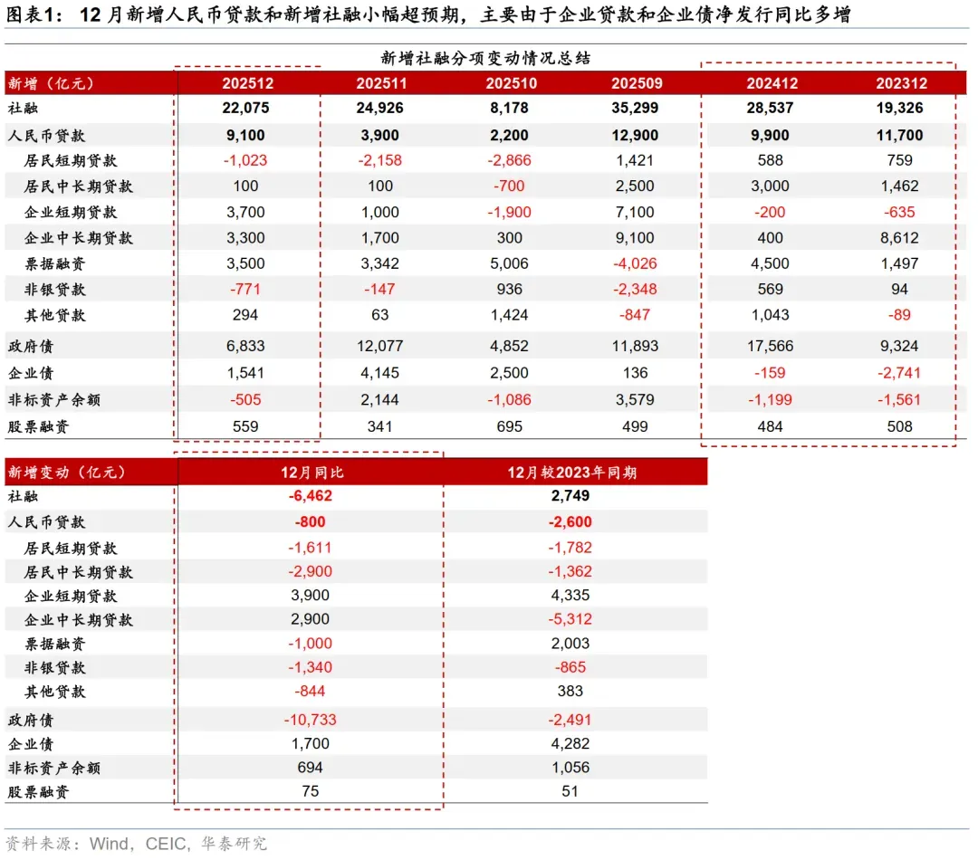 数据快评:12月新增人民币贷款与新增社融均小幅超市场预期、但同比少增,其中企业和居民贷款融资需求持续分化,主要反映基建相关融资有所加速,而地产需求承压下居民贷款需求持续偏弱。具体看,