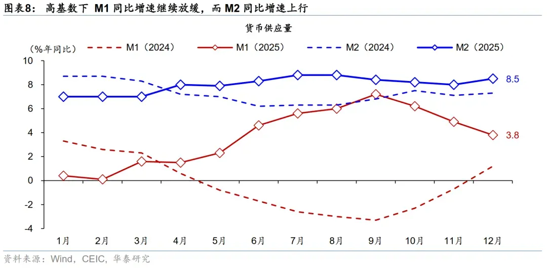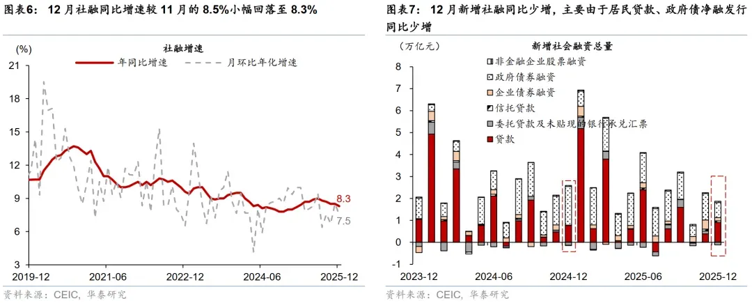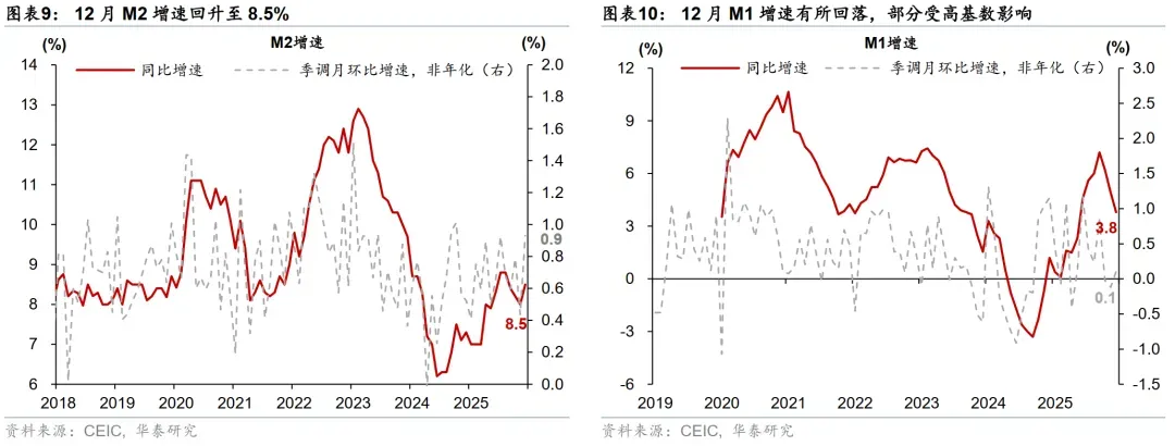 高基数下政府债净发行同比下降、财政存款增长同比加速形成短期“收缩”效应,但有望在2026年1季度有所缓解。由于2024年同期政府债放量发行,高基数下12月政府债净发行同比大幅少增1.07万亿元,而财政存款余额同比增速从11月的5.7%加速上行至12.6%,显示财政或为2026年经济“开门红”留有一定“储备”(参见《财政能否助力“开门红”?》,2025/12/28)。