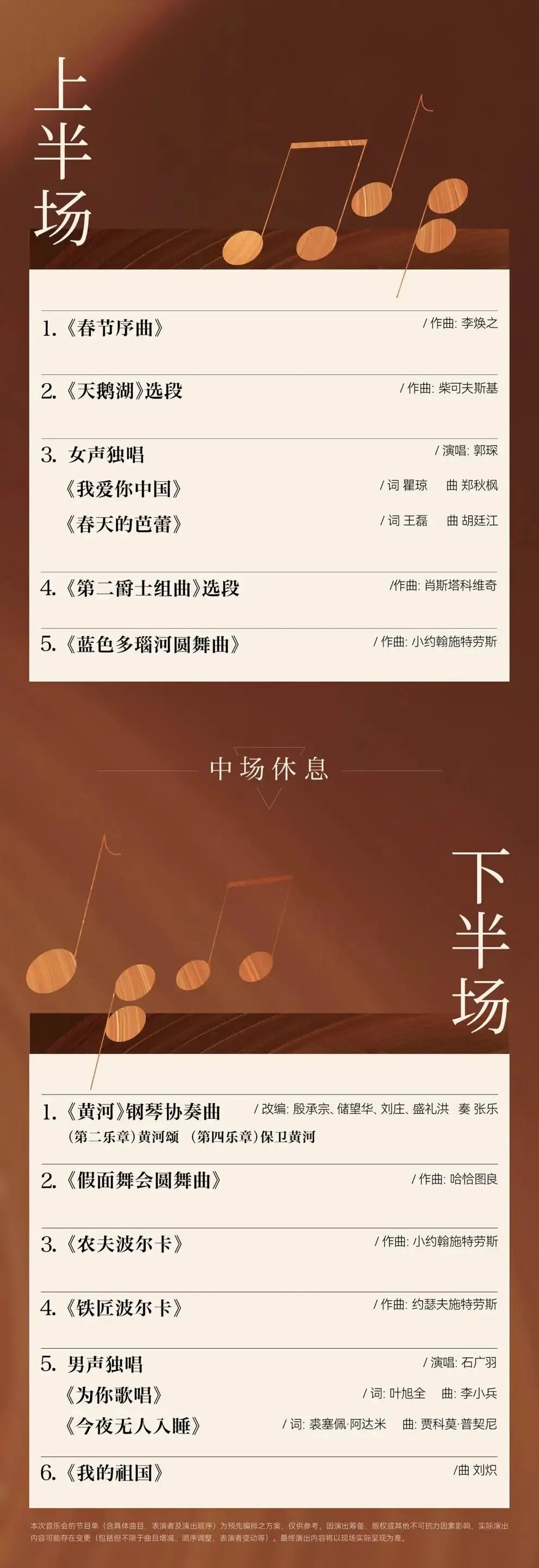 同时,音乐会还特邀两位实力唱将助阵:天津歌舞剧院首席男高音石广羽,嗓音富有金属质感与爆发力,被誉为“小钢炮”,曾荣获歌剧表演最高奖;国家文旅部“全国声乐领军人才”郭琛,屡获国内外声乐大奖,在《茶花女》等歌剧中有出色表现,嗓音清亮动人。