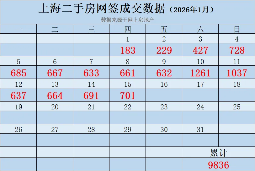 ▶ 上海1月二手房成交(统计截至1/15):1/15签约成交701套,1月二手房累计签约成交9836套(数据源自网上房地产);