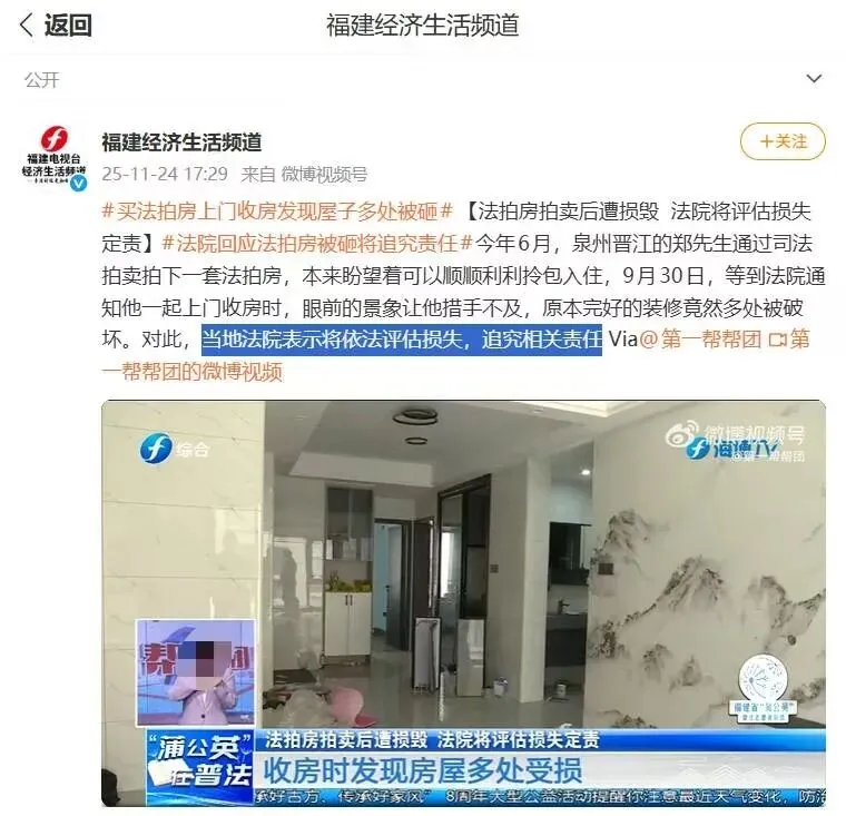 最近在泉州就发生一件很典型的案例,算是给大家提了个醒。有买受人找电视台帮忙,说他拍下晋江新塘宝龙世家一套精装房,当时之所以会看上这套房,是因为视频和图片拍出来装修很好。他一看法拍价格和同小区毛坯房报价相当,心想买下来不用装修直接入住,比买二手房划算。然而交房以后他傻了眼,室内墙面、地板、吊顶等够得着的地方全被破坏,不仅能搬的家具家电都被搬走,原业主走前甚至把门窗、衣柜、卫浴、冲水马桶逐一毁坏。这位买受人震惊之余找装修公司做了评估,损失大约4.4万。应该说每年法拍成交量这么大,这种属于极个别现象,毕竟法院都会告知,故意破坏房屋是要承担刑事责任的。而且拍卖款都在法院账户监管,破坏以后买方可以固定证据获得赔偿。因此,原业主这么做纯属破罐子破摔,如此泄愤对自己并无任何好处。本次事件无疑是个双输的结局,原业主干了一件蠢事,导致自身债务进一步加重,追究刑事责任可能还要坐牢。而买方被耽误了入住,心情也大受影响。但是话说回来,这事情表面看是买方运气不好,实际上也怪他自己昏了头,挑了个不明智的选项。我们看二手房就会知道,同小区尚有大量毛坯挂在网上,低至一平五千多,超过一年也卖不掉,绝大部分乡镇楼盘放到二手市场都是这样。明明有这么多没人要的房子,你买套崭新毛坯没人住过有何不好?若是在意装修费用,实在就差这么几万,担心买完房子没钱装修。那装修款可以找卖方要,想装修得多好,价格就砍多少。乡下房子压根没人跟你抢,这么廉价的小区还买法拍房有何必要?