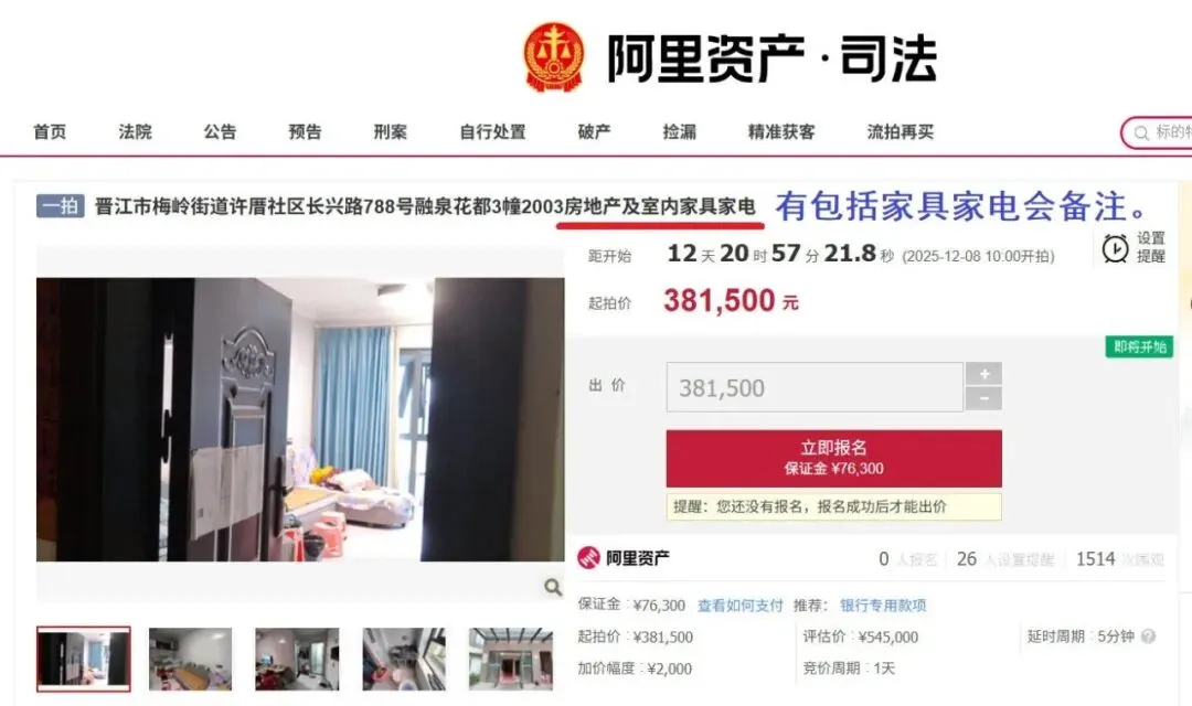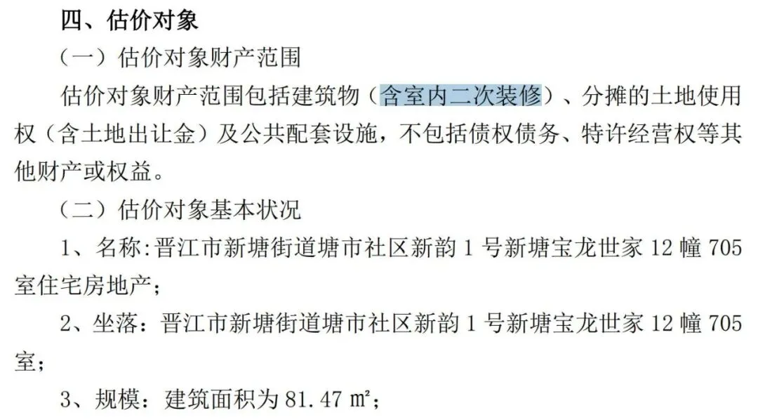 其实我们翻翻阿里平台就会明白,网站上写得清清楚楚,拍卖房源有包括家具家电的会特别备注。如果只卖房屋本身,在评估报告上也会明确写出,估价对象财产范围除了建筑物本身,一般只含二次装修。也就是说,只要没有特别注明带家具家电拍卖,拍下后房东会把可移动的物品都搬走。看上去很漂亮的精装、豪装,到你手上只是一间空屋,这就和买二手房有明显不同。所以我才一再强调,买法拍房需要更多的房地产知识。虽然这年头程序规范、成交量高,还有专门的法服公司、拍卖公司辅助,但法拍房毕竟不同于二手房,最好自己先学精通。