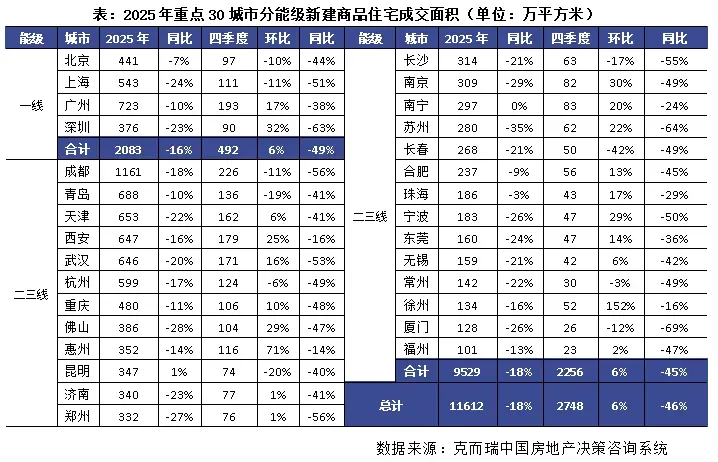 具体来看,新房方面,克而瑞监测数据显示,2025年全国重点30城新建商品住宅成交面积约1.16亿平方米,同比下降18%,降幅较2024年显著收窄。