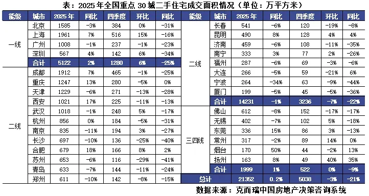 克而瑞监测数据显示,2025年全国30个重点城市新增住房成交面积约3.26亿平方米,同比降7%。