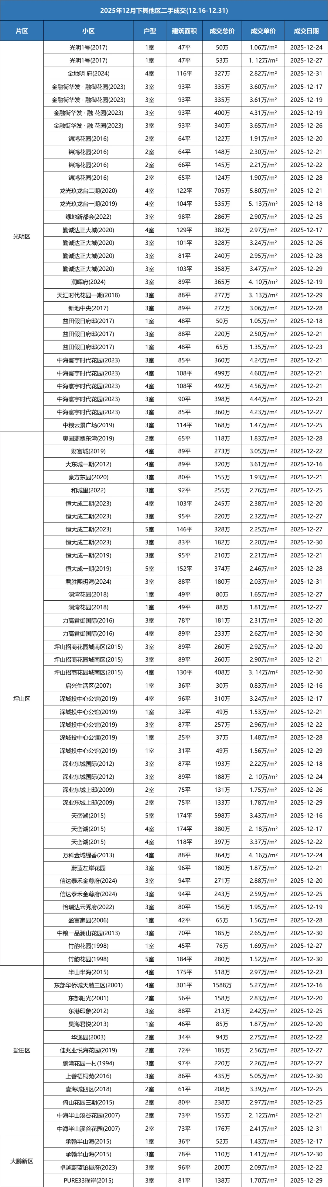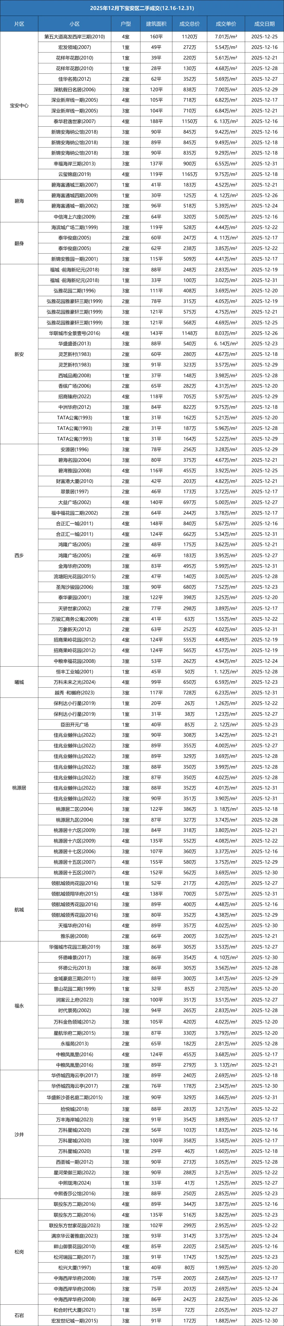 常规统计2025年12月下旬(12月16日-12月31日)深圳二手房成交数据,共统计有868套,其中龙岗有232套,占总成交的26.73%。而南山、宝安、福田成交量都比较均衡,分别是120套、122套和122套。