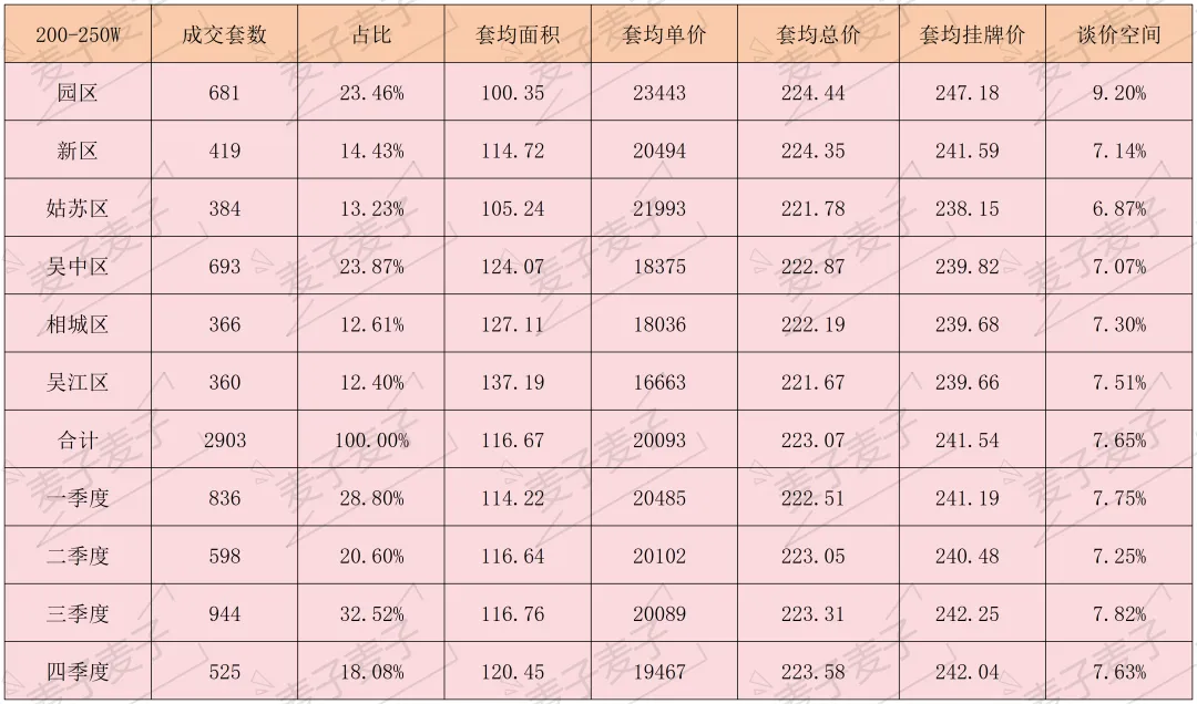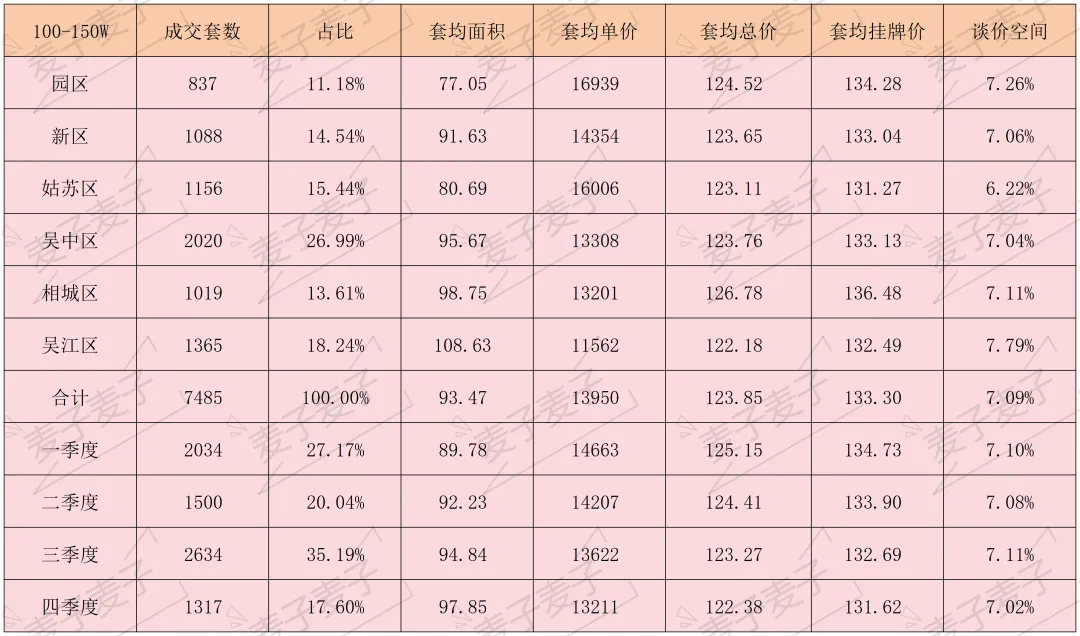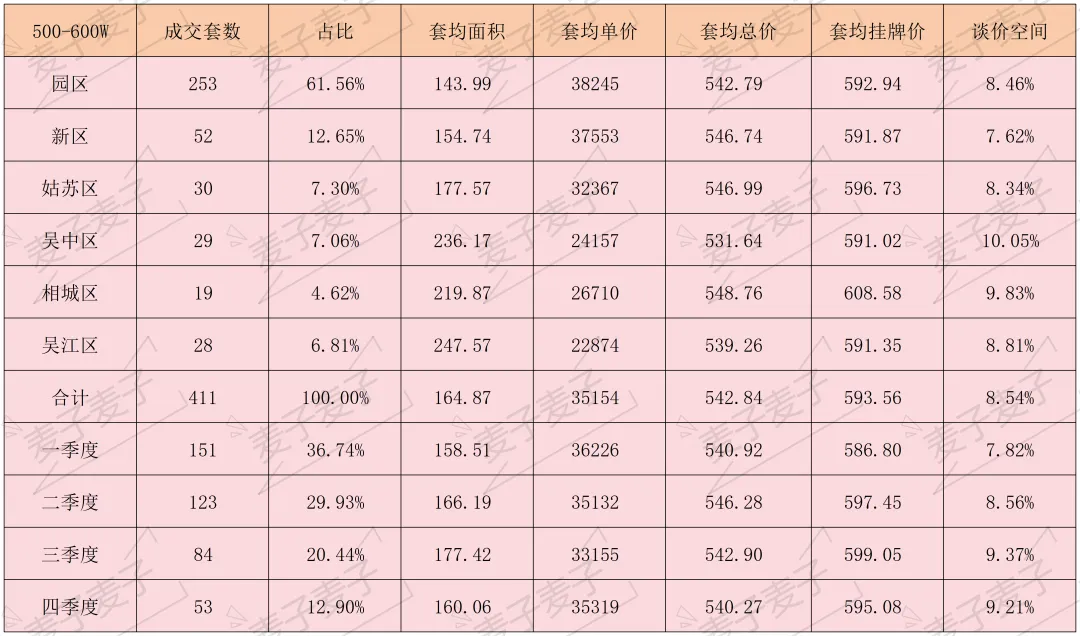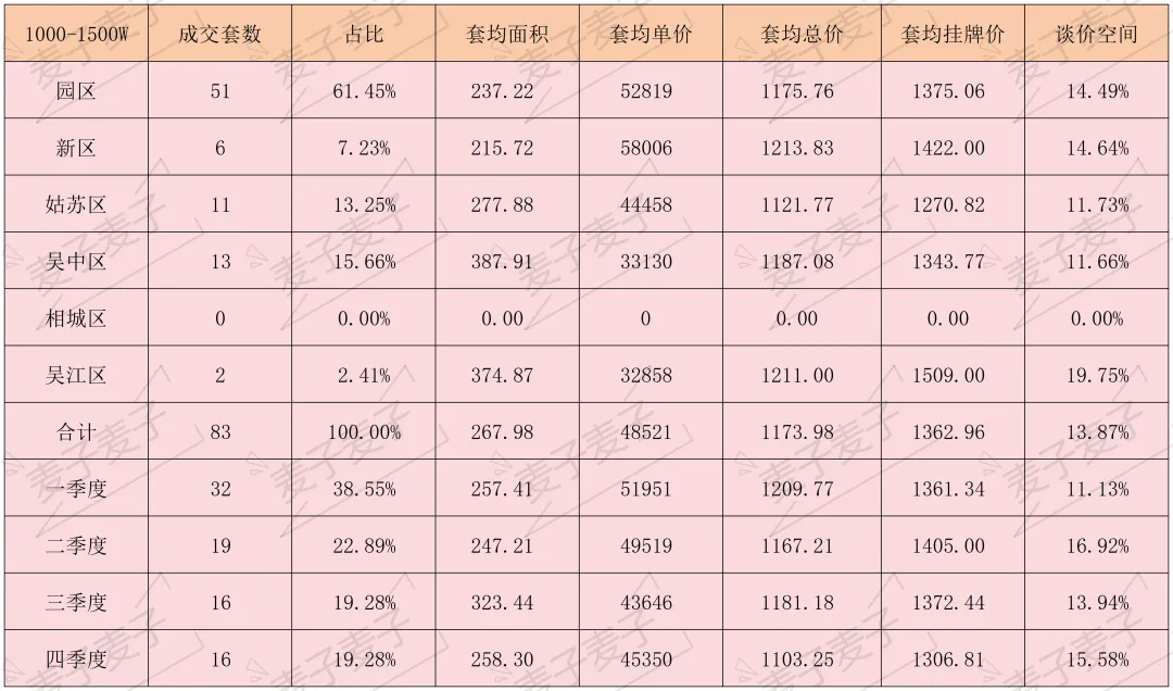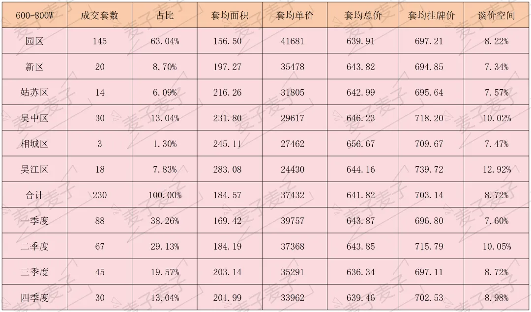 这个总价段的二手,有超过一半选择了园区,新区占比微幅上涨,两区占比超过70%300W以上的二手客群,尤其400W以上,园区遥遥领先于其他区但是这10%的买房人中,50%左右选择了园区,15%左右选择了新区600-800W的客户,园区依然稳定,还是超60%吴中区占比也开始上涨,从面积段判断,吴中的别墅开始有吸引力,相反相城占比非常少600W+的客户群体,除了园区之外,目光开始往叠墅、联排方向靠拢了上文讲了,800W+的二手成交,只占了全部成交的1%不到大客户成交除了园区独占鳌头,吴中和姑苏区也开始有了起色要么150W以内的刚需占比高,要么1000W+以上的别墅占比高其实1000W以上,尤其1500W以上总价段的成交,好了,看了上面这么多成交,可以简单地总结一下各区二手情况:300W以上购买力充足,尤其400W+改善客户,园区占比超过50%对200—500W中间段客群群体,选择有限,吸引力低于园区和新区150W以内的客群,吴中占比最高,150-300W的客群,也有部分选择尤其600-1000W这个阶段的二手房,成交比例极低关于几个区的详细数据,后面会一一更新,本文就不多介绍再次提醒一下,本文数据仅供参考,如有不同看法,请以自己判断为准如果觉得文章数据有用,可以转发给身边考虑买房卖房的朋友进楼市交流群
