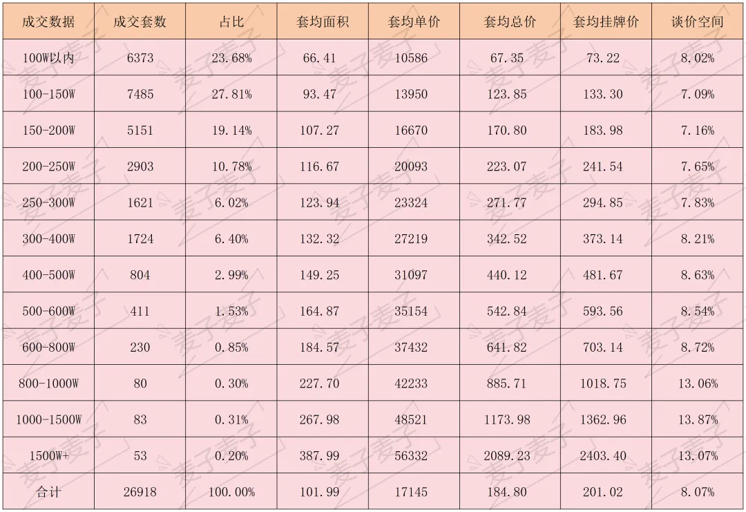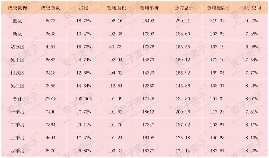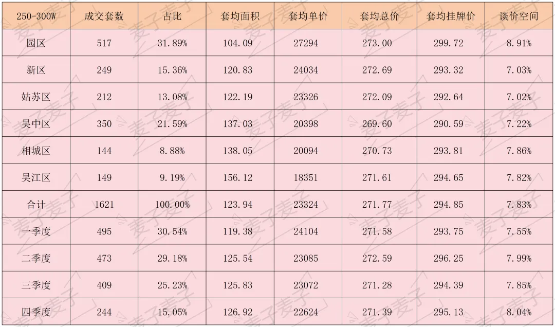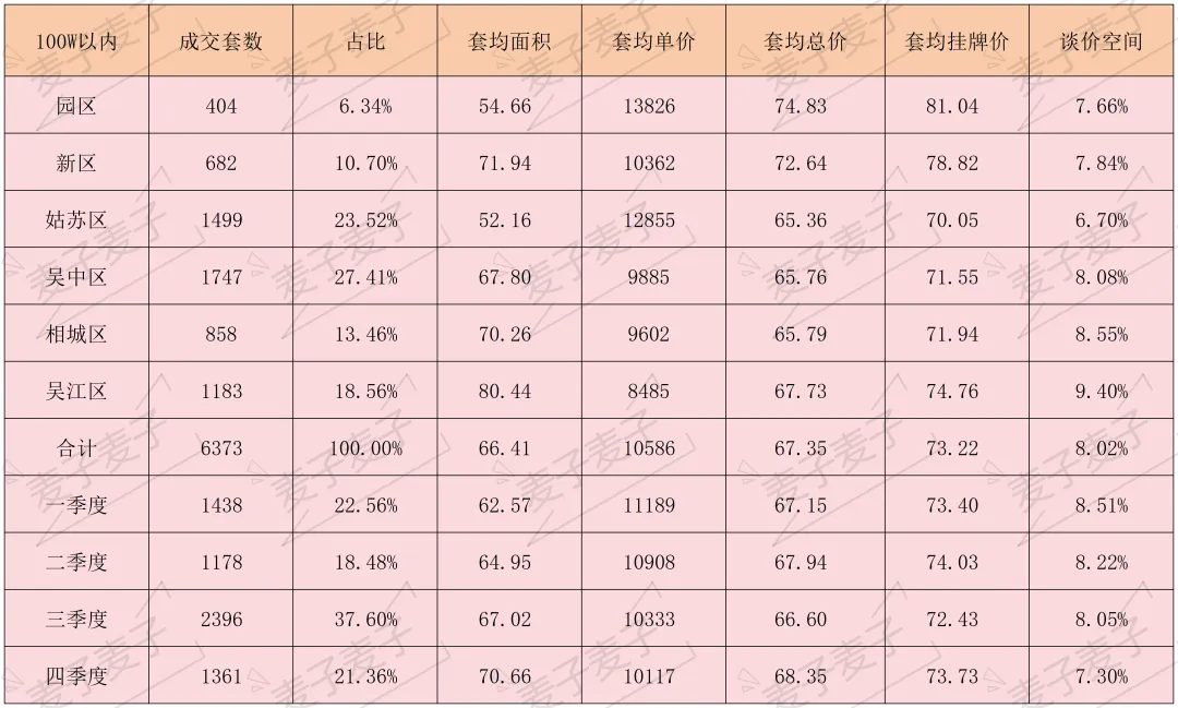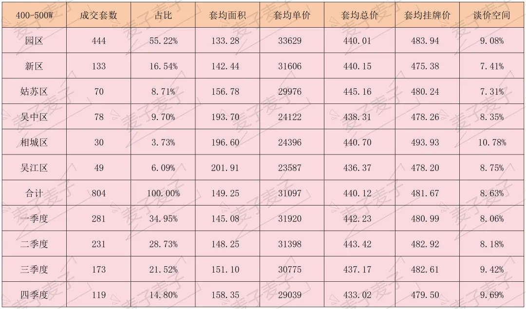 这个总价段的二手,有超过一半选择了园区,新区占比微幅上涨,两区占比超过70%300W以上的二手客群,尤其400W以上,园区遥遥领先于其他区但是这10%的买房人中,50%左右选择了园区,15%左右选择了新区600-800W的客户,园区依然稳定,还是超60%吴中区占比也开始上涨,从面积段判断,吴中的别墅开始有吸引力,相反相城占比非常少600W+的客户群体,除了园区之外,目光开始往叠墅、联排方向靠拢了上文讲了,800W+的二手成交,只占了全部成交的1%不到大客户成交除了园区独占鳌头,吴中和姑苏区也开始有了起色要么150W以内的刚需占比高,要么1000W+以上的别墅占比高其实1000W以上,尤其1500W以上总价段的成交,好了,看了上面这么多成交,可以简单地总结一下各区二手情况:300W以上购买力充足,尤其400W+改善客户,园区占比超过50%对200—500W中间段客群群体,选择有限,吸引力低于园区和新区150W以内的客群,吴中占比最高,150-300W的客群,也有部分选择尤其600-1000W这个阶段的二手房,成交比例极低关于几个区的详细数据,后面会一一更新,本文就不多介绍再次提醒一下,本文数据仅供参考,如有不同看法,请以自己判断为准如果觉得文章数据有用,可以转发给身边考虑买房卖房的朋友进楼市交流群