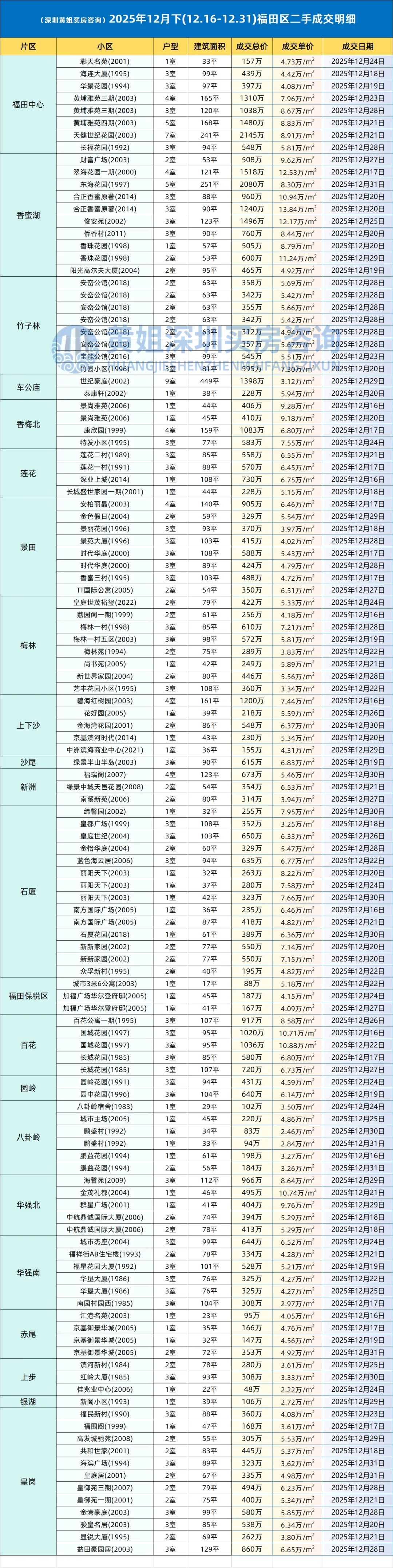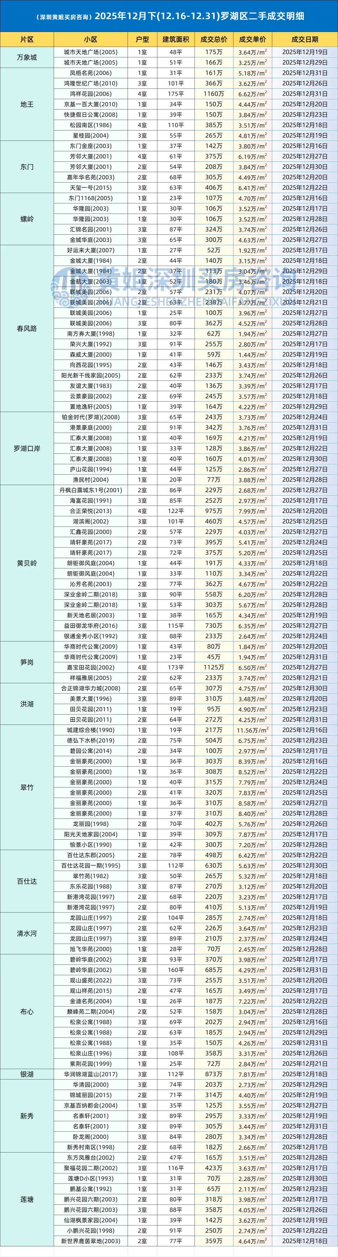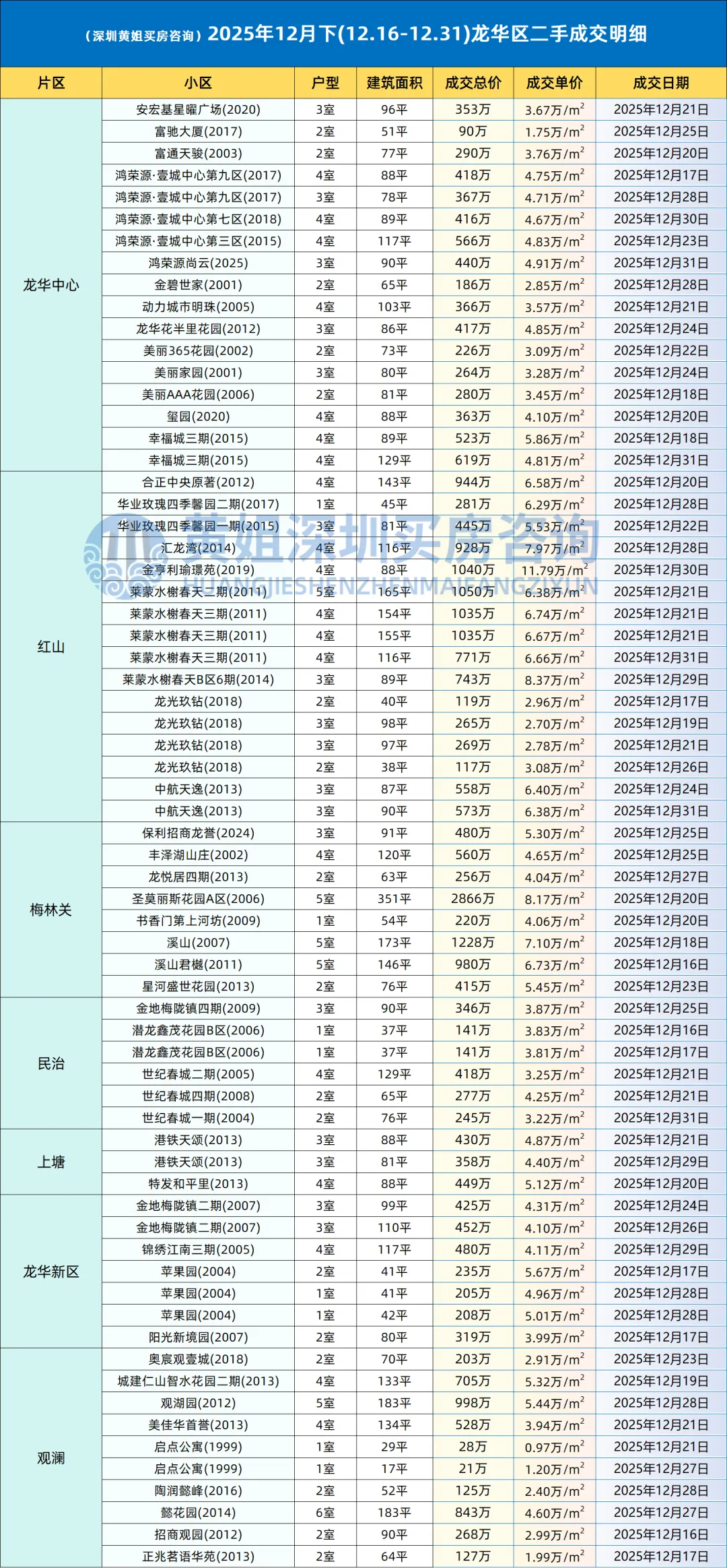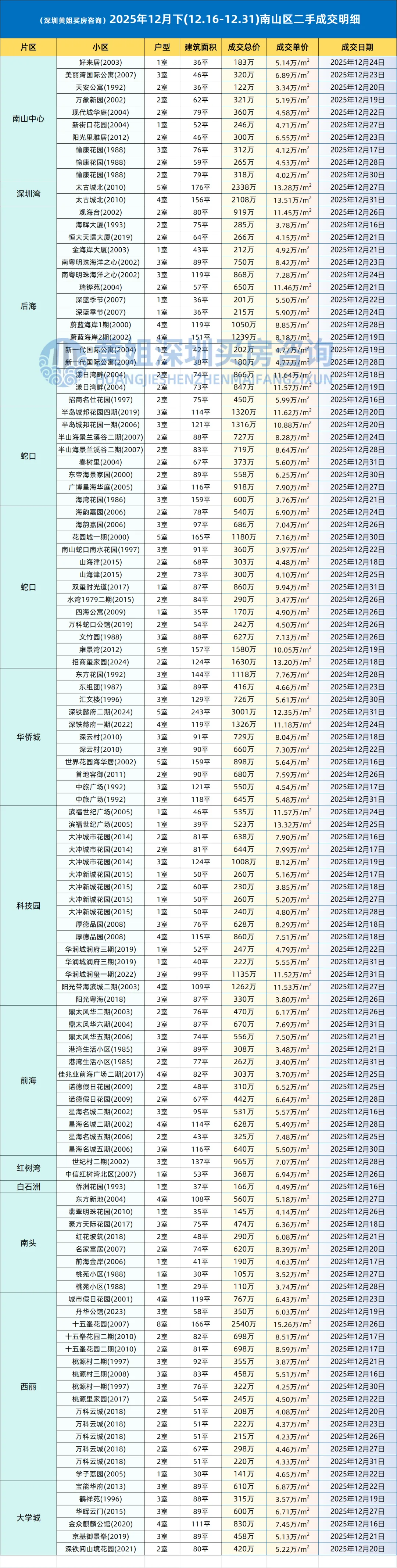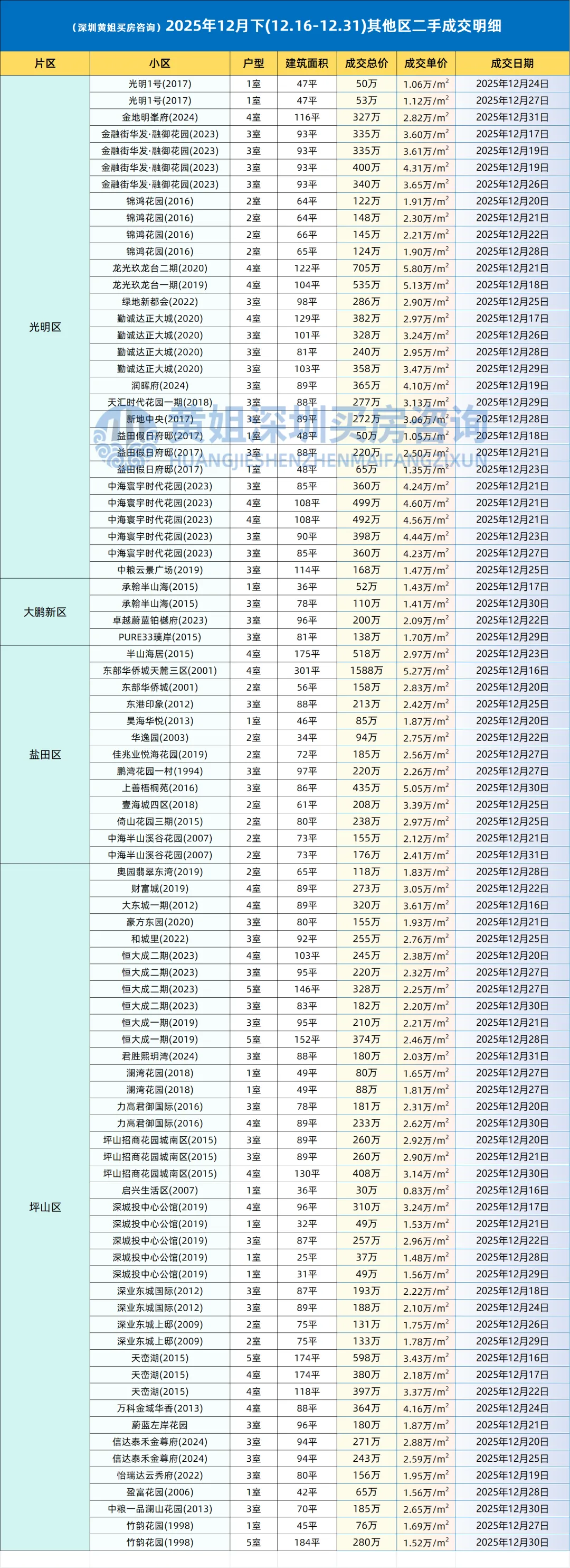 1.以上为2025年12月深圳一部分小区成交记录,该数据来源于部分机构,不代表市场全貌。