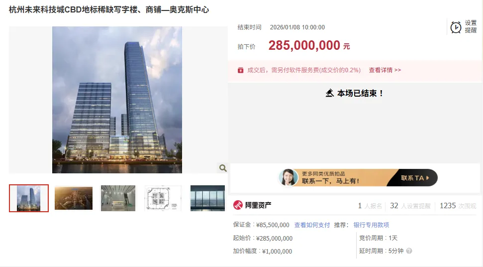阿里资产网显示,杭州未来科技城CBD地标奥克斯中心近期拍卖成交,起拍价与成交价均为2.85亿元。该标的为商业用房,总建筑面积3.94万平方米,涵盖34-59层写字楼及1-2层商铺,主力户型580-2400㎡;其中2.65万平方米已出租,年租金约1300万元。竞拍需缴纳8550万元保证金至支付宝冻结,成交后转为履约保证金,未成交则活动结束即时解冻,冻结期间不计利息。