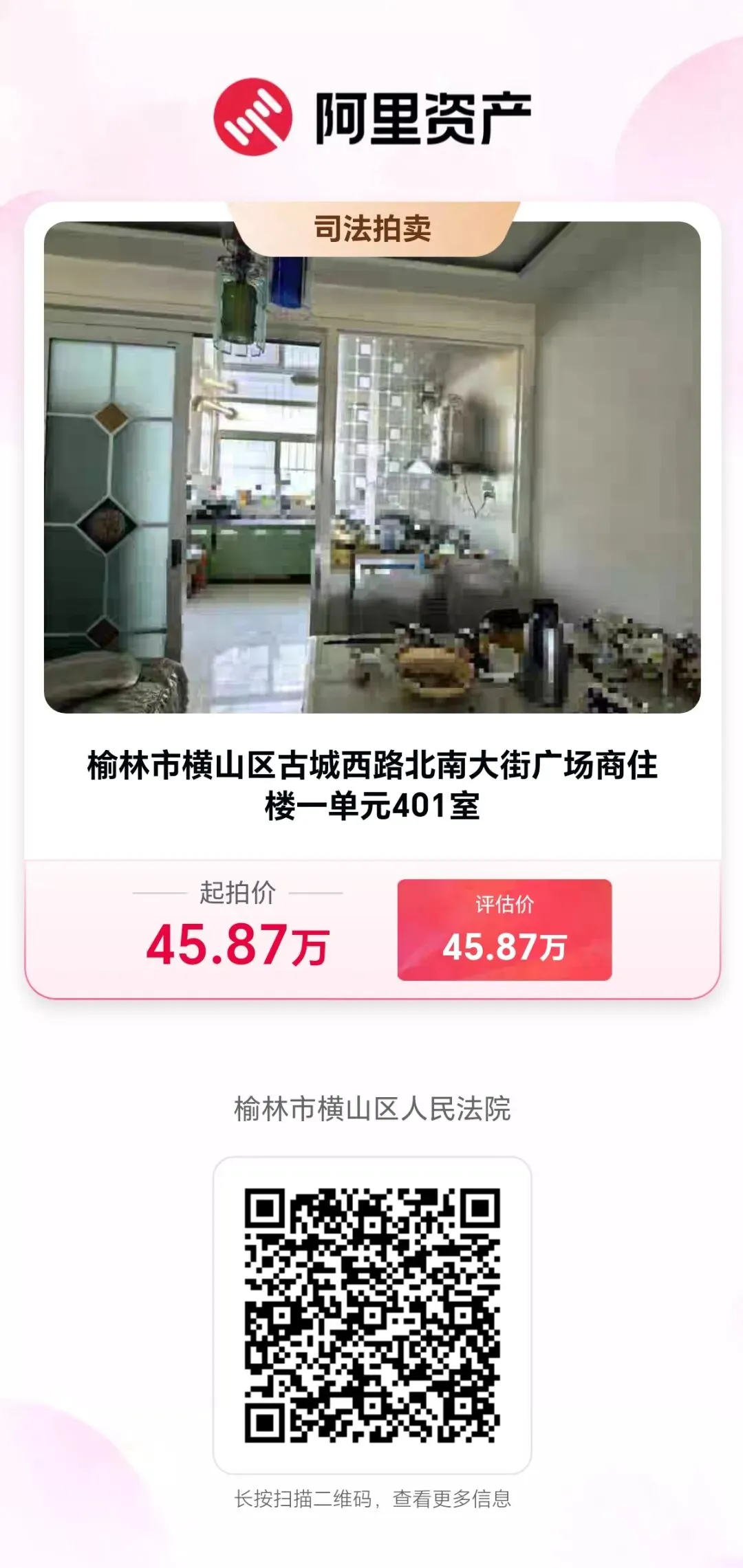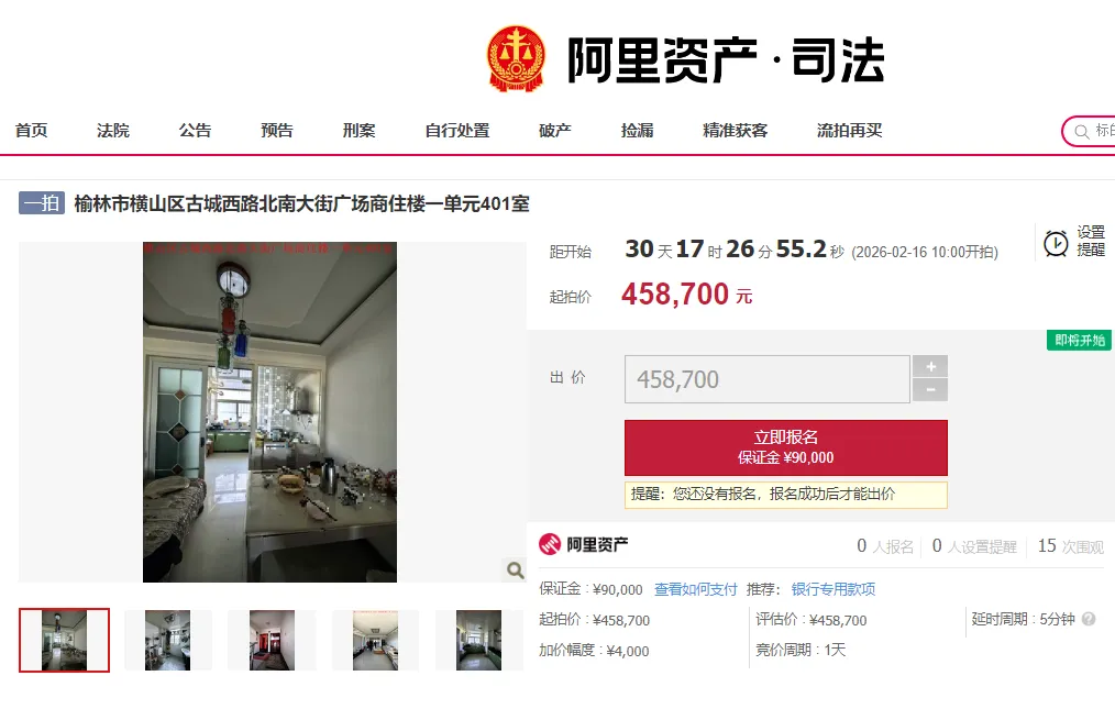 2月16日10时至17日10时,横山法院将在淘宝网司法拍卖平台上,拍卖横山区南大街广场商住楼房产,45.8万元起拍!