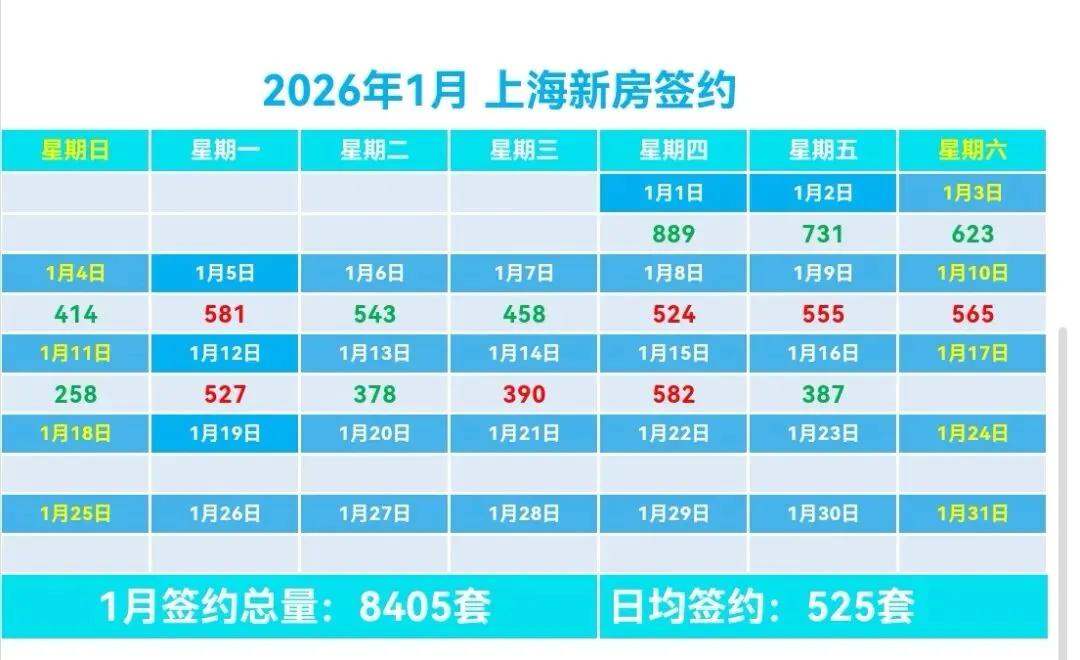 🏠1月上海新房总签约8405套,日均签约525套,本月签约总面积55.38万m²,套均面积68.71m²。