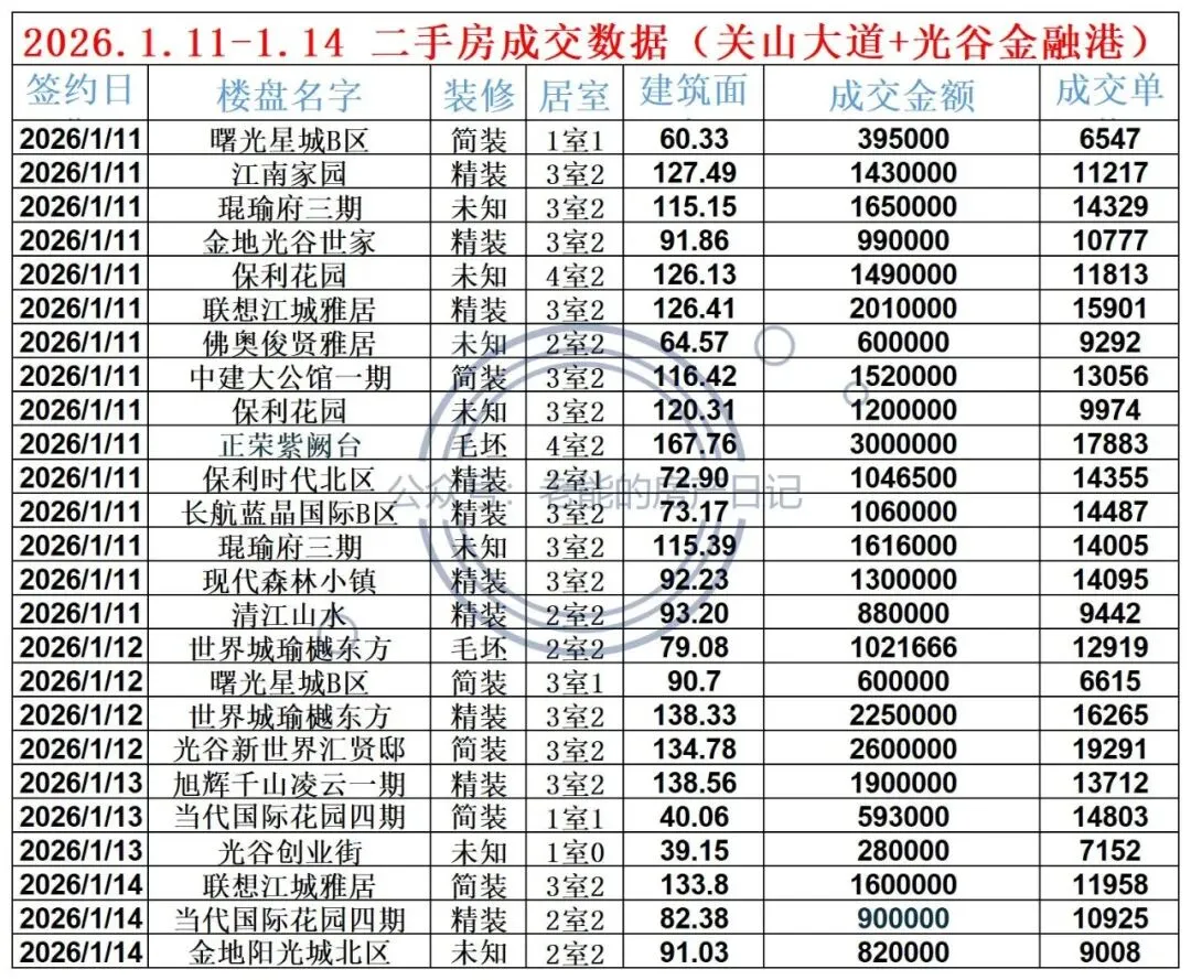 2026.1.11-1.14 二手房成交数据 (关山大道+光谷金融港)