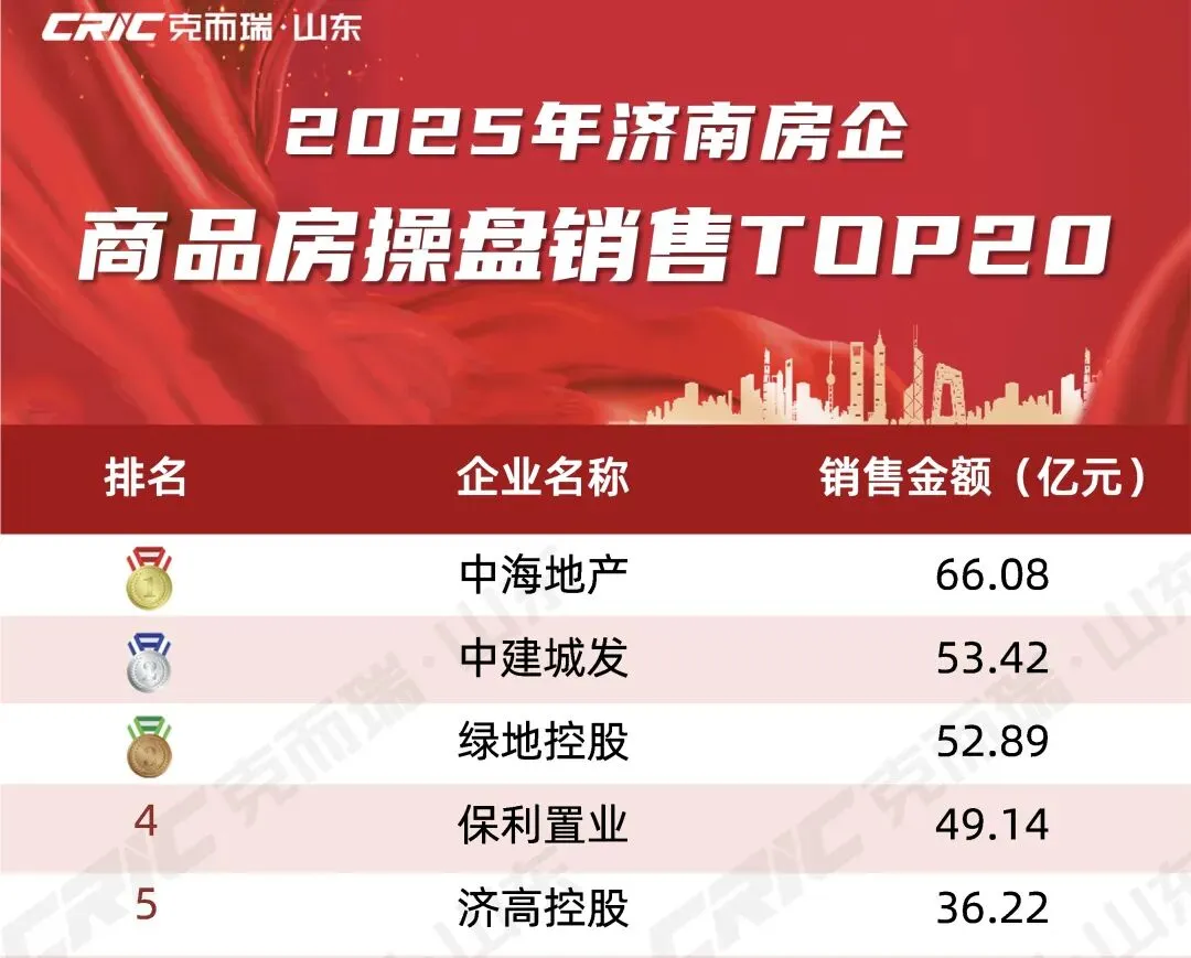 在山东地区,中建城市发展取得相当突出的业务表现,2022至2024年,连续三年位列济南楼市成交金额榜首,2025年又以53.42亿销售额位列济南楼市TOP2。