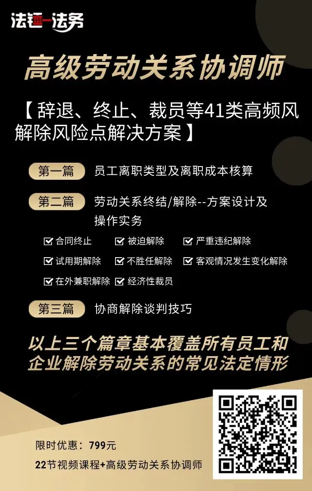 版权说明:文章来源类案同判规则、由法锤讲堂转载发布。转载内容的版权仍归原创者所有,若有来源标注错误、内容不当失实或侵犯到您的权益,烦请联系删除。法锤带来《辞退、终止、裁员等41类高频解除风险点解决方案》覆盖主动辞职、被动辞职、不符合录用条件解除、不胜任解除扫描下图二维码即可购买