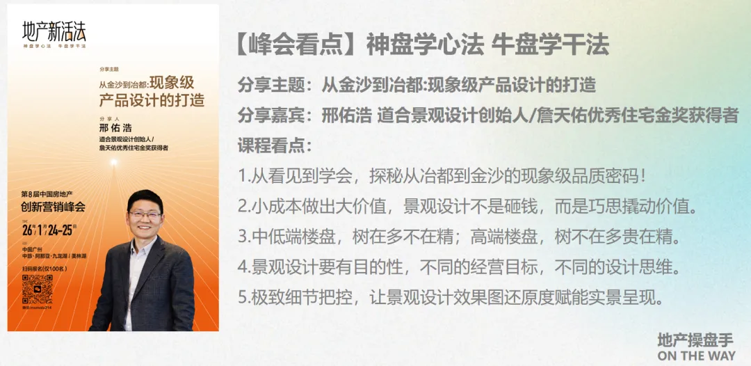 峰会还邀请了金沙、冶都、新东升等名盘的首席设计负责人,如何在有限售价内打造高口碑、高利润的好房子,以及现象级产品的居住新场景。