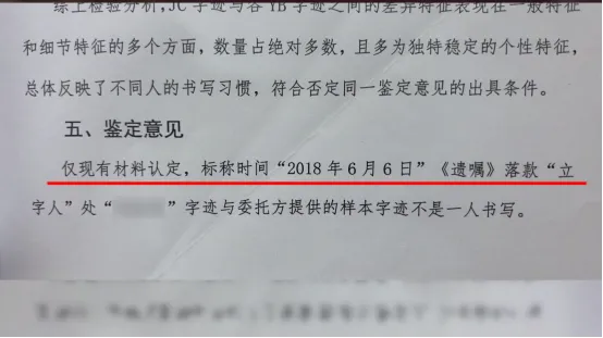 经鉴定,遗嘱不是本人亲笔书写。开庭审理期间,这份遗嘱因真实性存疑,最终未被法院采纳。