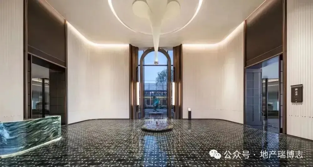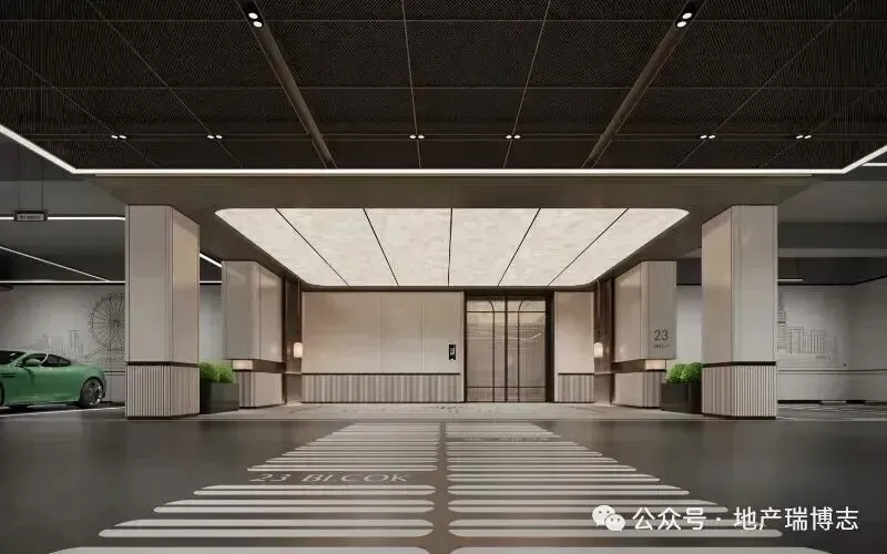 车库内也实现美学升级:利用线性灯光提升指引效果,以氛围灯光营造更舒适的光影环境。架空车库车马厅增加艺术造景,以提升归家体验、增强仪式感。