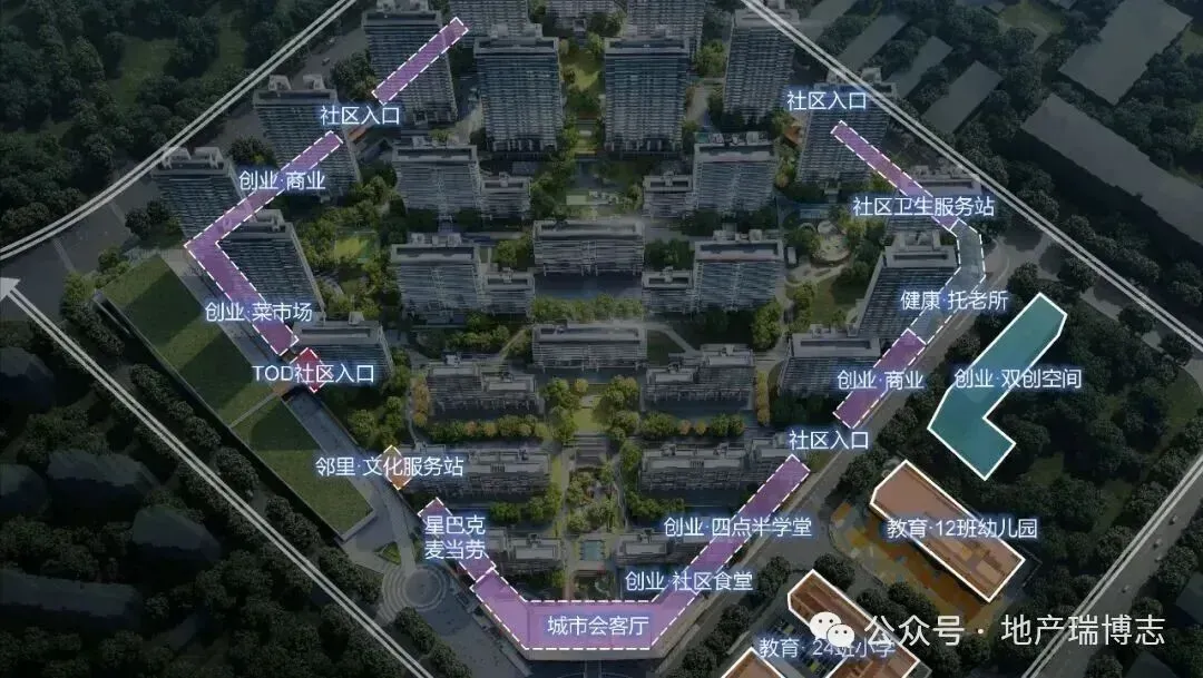 自带商业配套超6000㎡,还有超3000㎡会所及泛会所服务设施,提供大量邻里休闲、交往空间,实现社区内的一站式服务。社区底层外围布置菜场、特色店铺、幼教中心、养老机构、创业支持等社区及城市公共服务功能,使城市的生活属性与便利特性得以在社区外围充分实现。