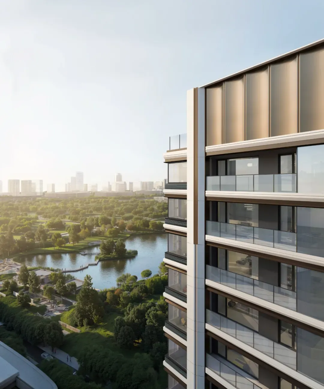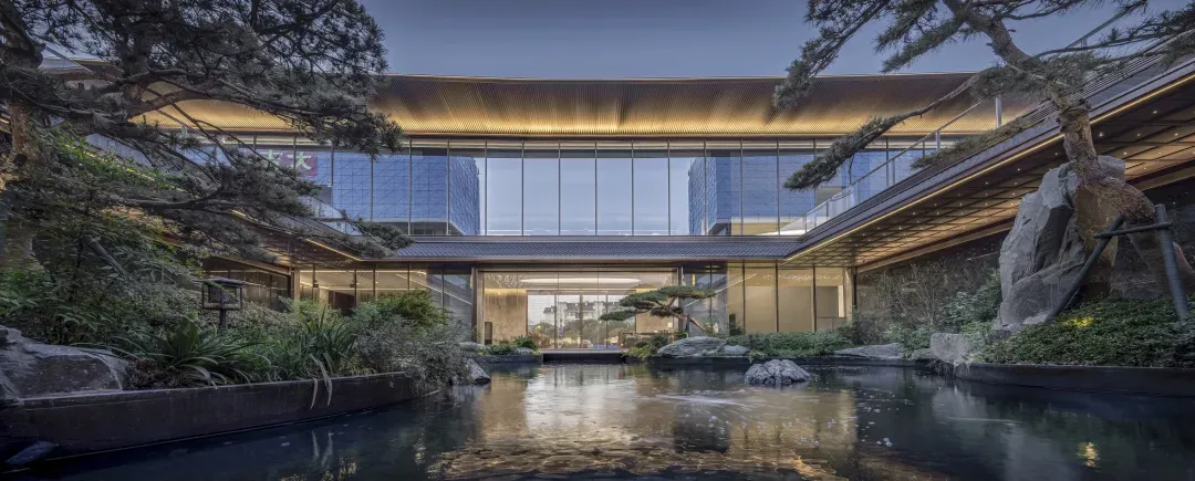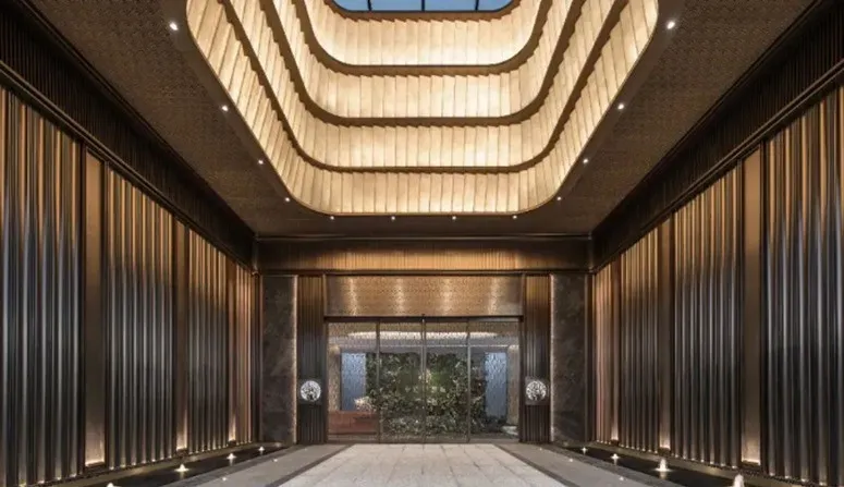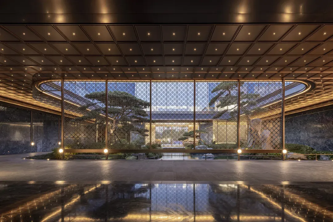 由古铜色铝板与浅香槟金铝板勾勒出「M+水波纹」造型,像给建筑戴了一顶会反光的「礼帽」。这既是呼应项目旁的泮湖水景,也是对金茂满系理念的符号化。