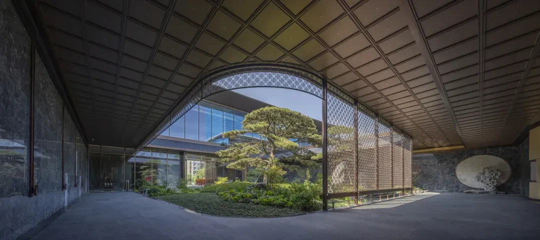 3000平方米横向宽度的港湾广场,宽广温馨;酒店式设计的无雨落客区,贴心周到;62米高的重檐金顶,轻盈如翼。12米高的云石藻井,曲水水纹,将古建筑中的藻井转译为现代空间。