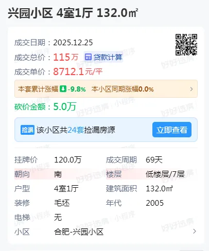 兴园小区132平户型,成交总价115万元,成交单价8712.1元/㎡。
