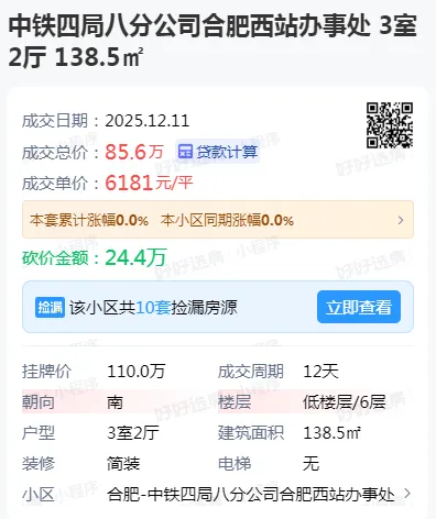 中铁四局八分公司合肥西站办事处138.平户型 ,成交总价85.6万元,成交单6181元/㎡。