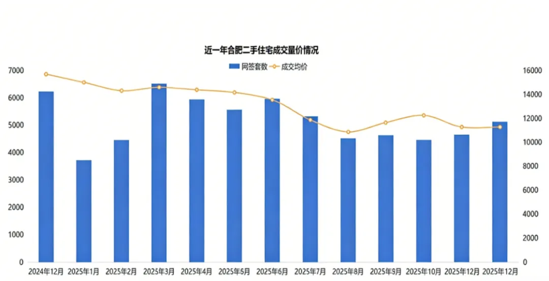合肥二手房市场整体仍处于调整期。2025年12月,全市二手房住宅网签5135套,环比上升9.93%,但同比下滑17.63%。成交均价为11290元/㎡,环比微降0.16%,同比下跌28.06%。这一数据反映出市场仍处于探底过程中,但成交量环比回升也显示出市场活跃度有所恢复。