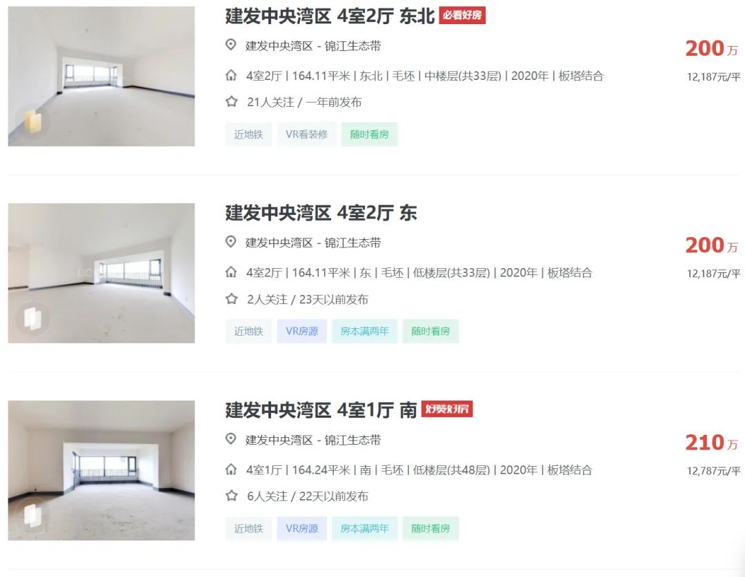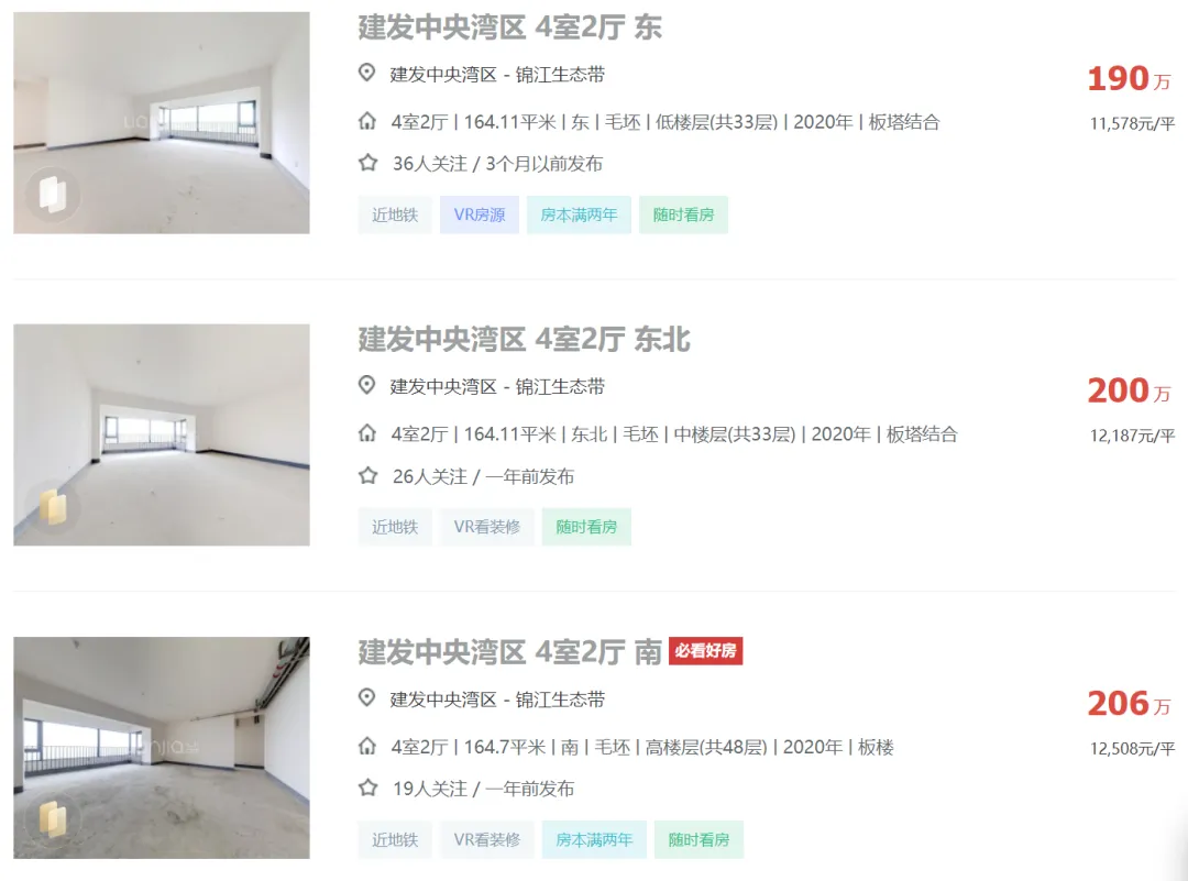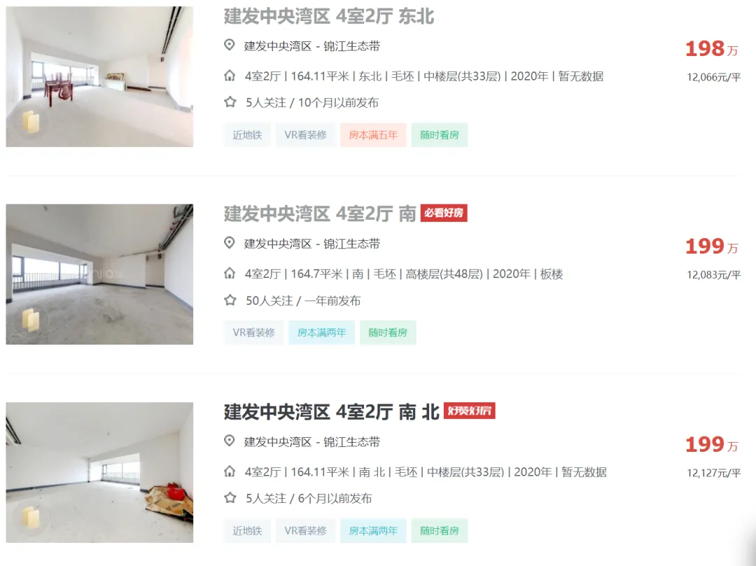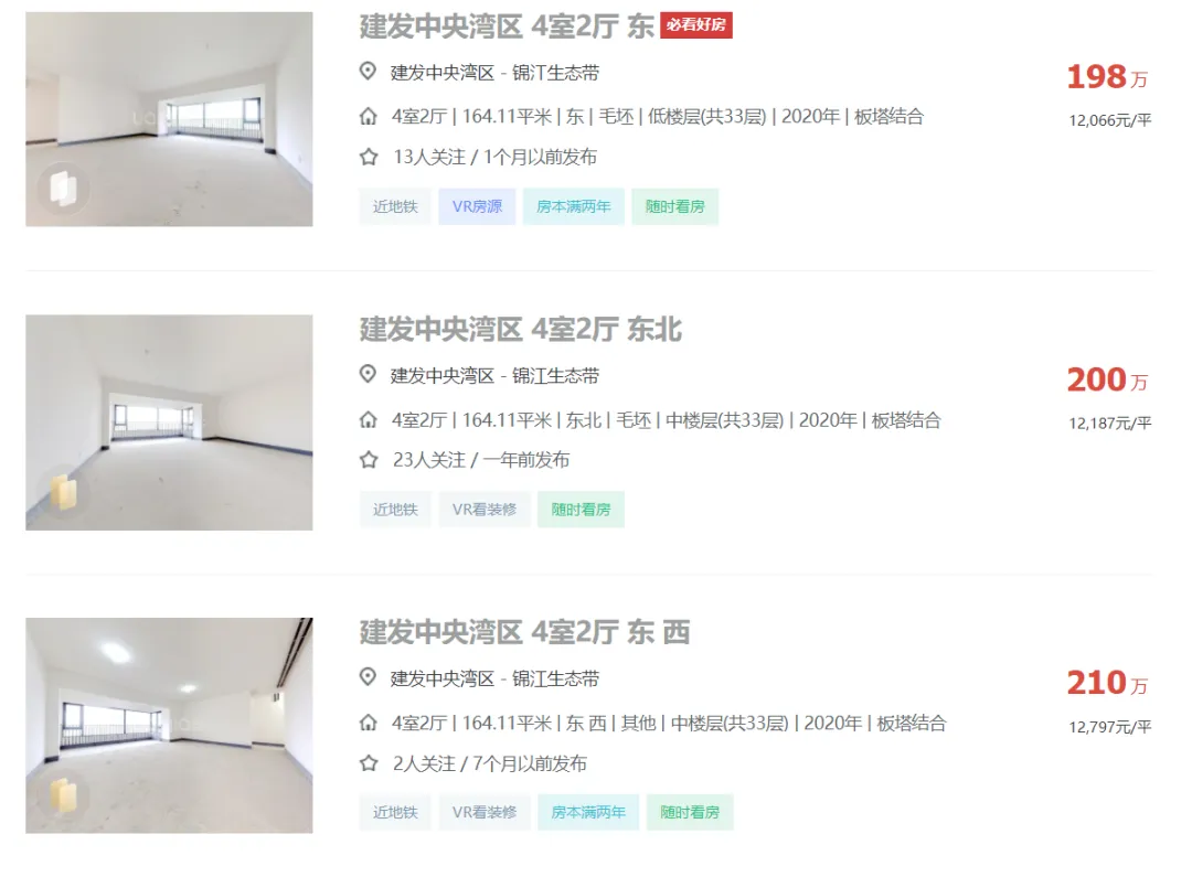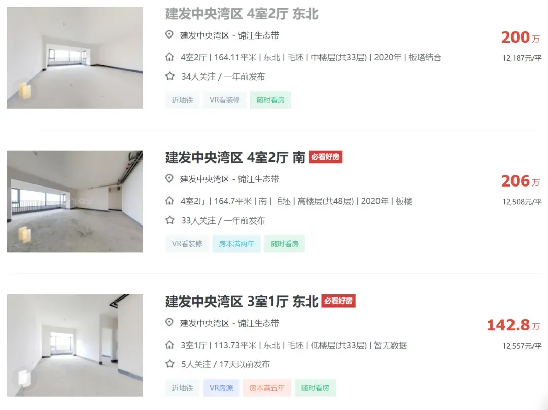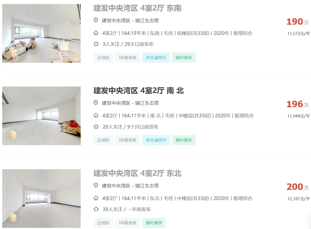 2024年04月05日,有多位中介发布信息:天府新区成都建发中央湾区164平江景套四一口价200万,还赠送车位一个,单价1.21万,原价卖希望遇到有缘人。