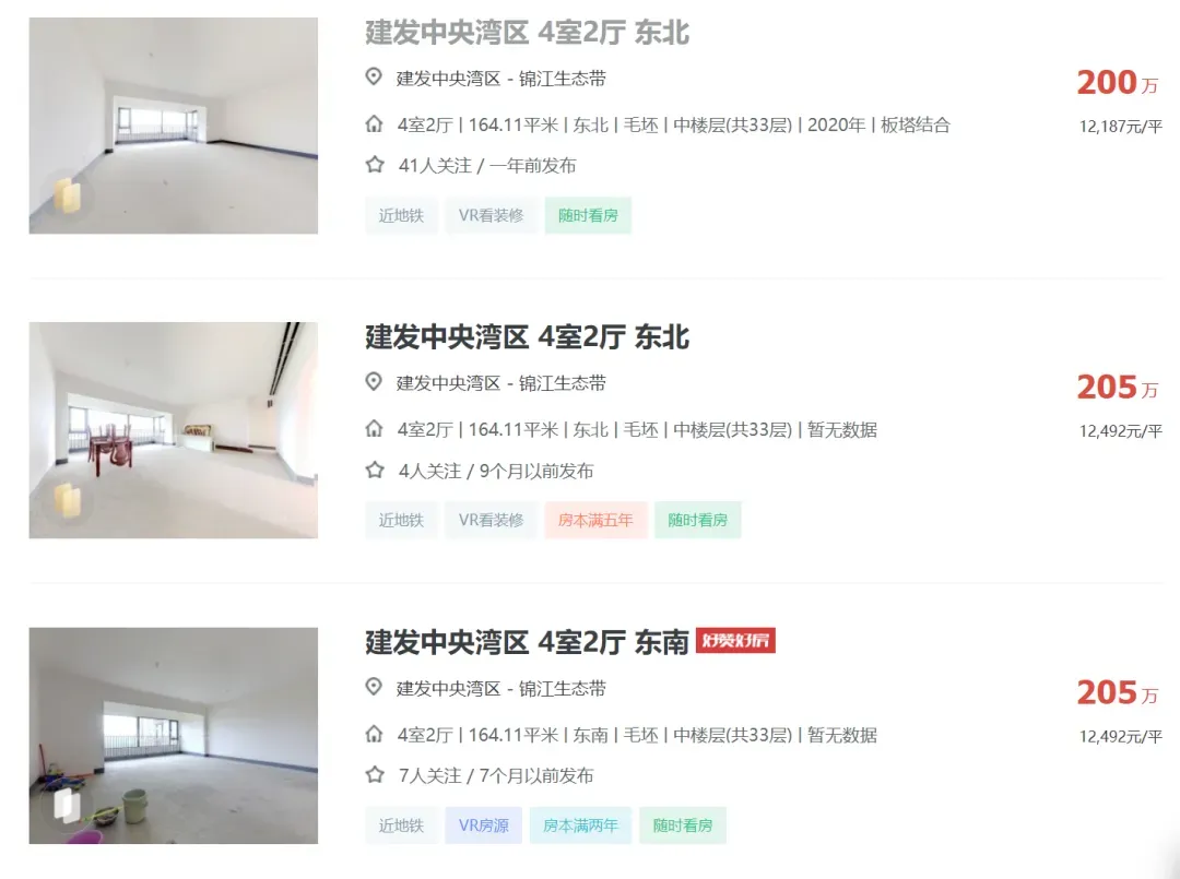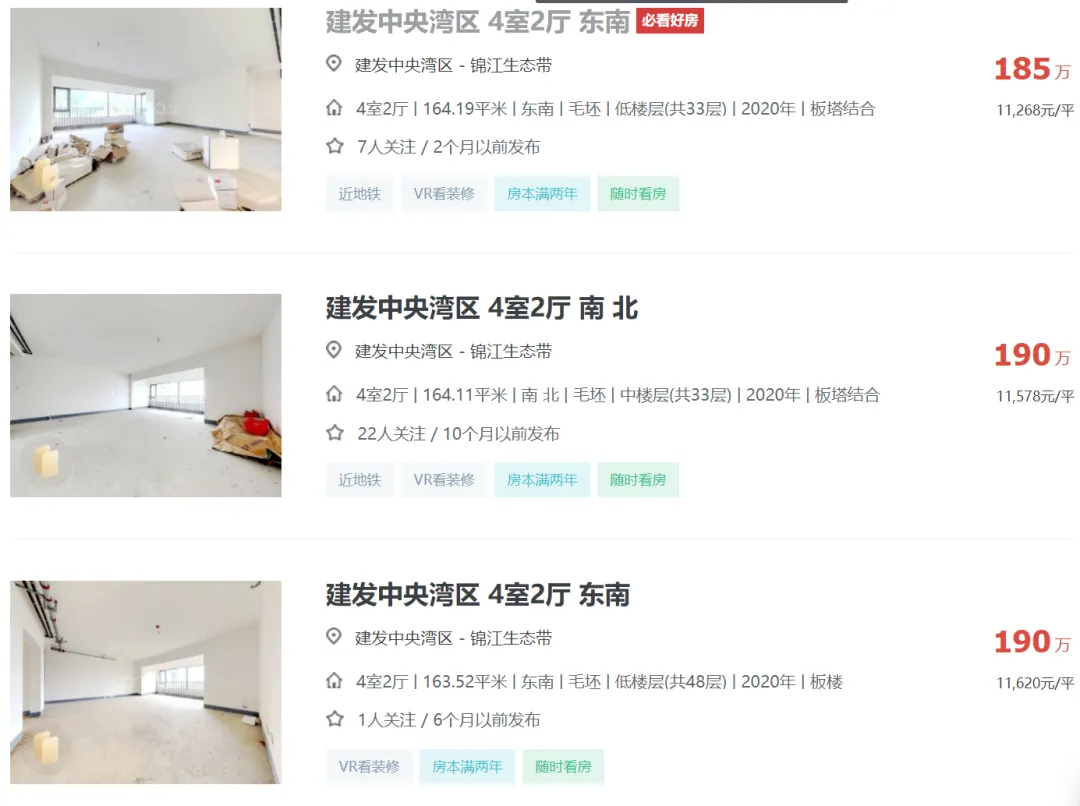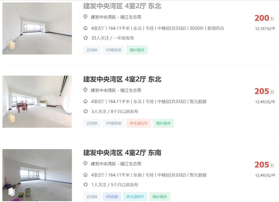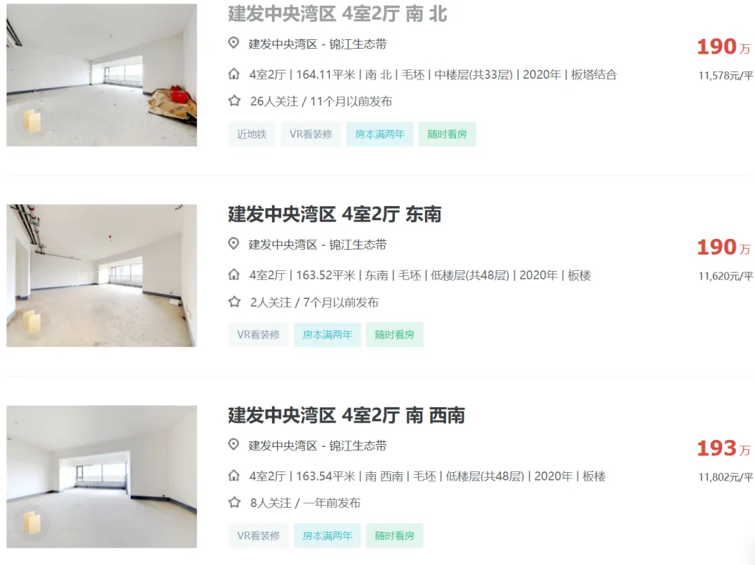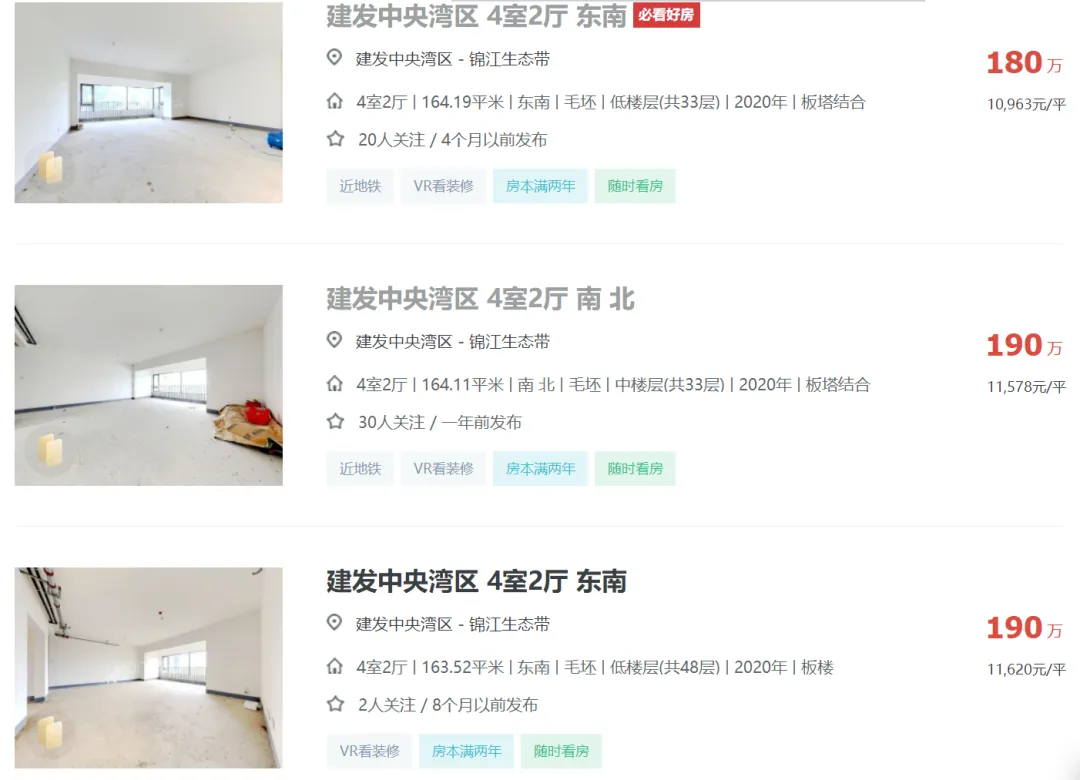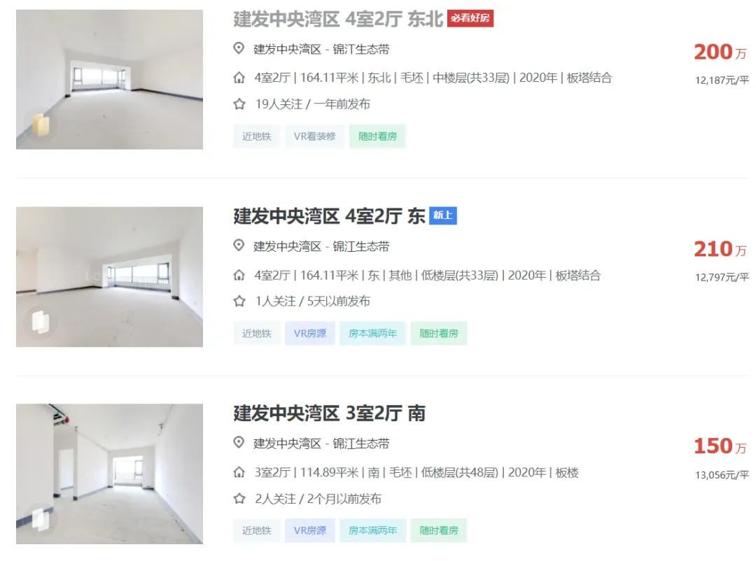 2024年04月05日,有多位中介发布信息:天府新区成都建发中央湾区164平江景套四一口价200万,还赠送车位一个,单价1.21万,原价卖希望遇到有缘人。