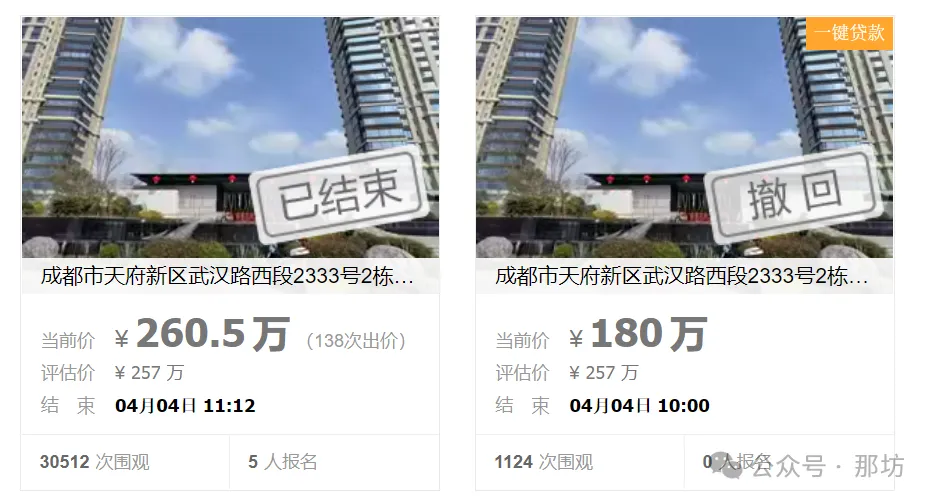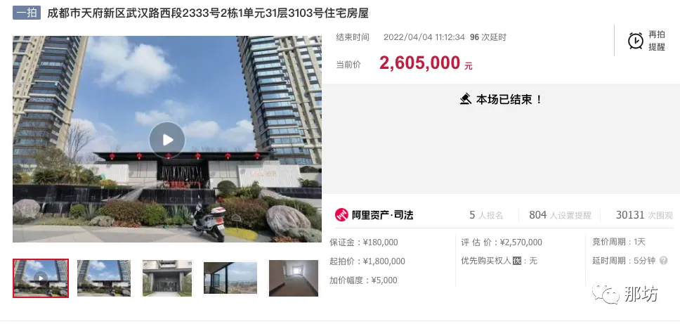 通过竞买号W8550于2022/04/04 11:12:34在成都市武侯区人民法院于阿里拍卖平台开展的“成都市天府新区武汉路西段2333号2栋1单元31层3103号住宅房屋”项目公开竞价中,以最高应价胜出。该标的网络拍卖成交价格:¥2605000(贰佰陆拾万零伍仟元)