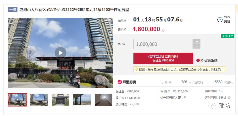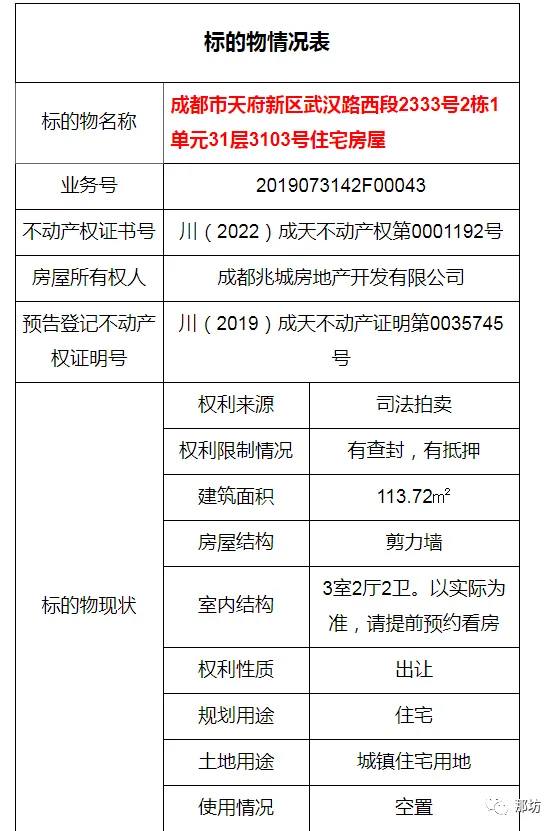 成都市天府新区武汉路西段2333号2栋1单元31层3103号住宅房屋;建筑面积:113.72㎡,起拍价:180万元;保证金:18万元;拍卖时间2022年4月3日10时至2022年4月4日10时
