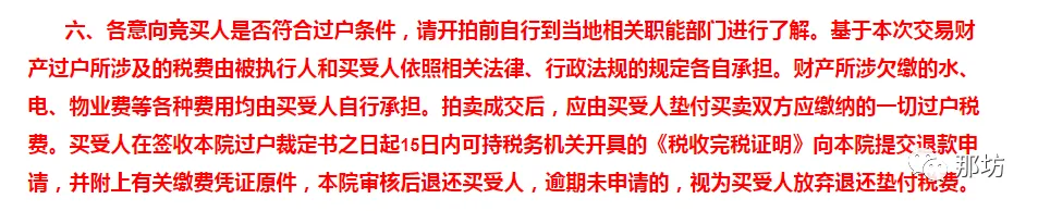 基于本次交易财产过户所涉及的税费由被执行人和买受人依照相关法律、行政法规的规定各自承担。财产所涉欠缴的水、电、物业费等各种费用均由买受人自行承担。拍卖成交后,应由买受人垫付买卖双方应缴纳的一切过户税费。买受人在签收本院过户裁定书之日起15日内可持税务机关开具的《税收完税证明》向本院提交退款申请,并附上有关缴费凭证原件,本院审核后退还买受人,逾期未申请的,视为买受人放弃退还垫付税费。