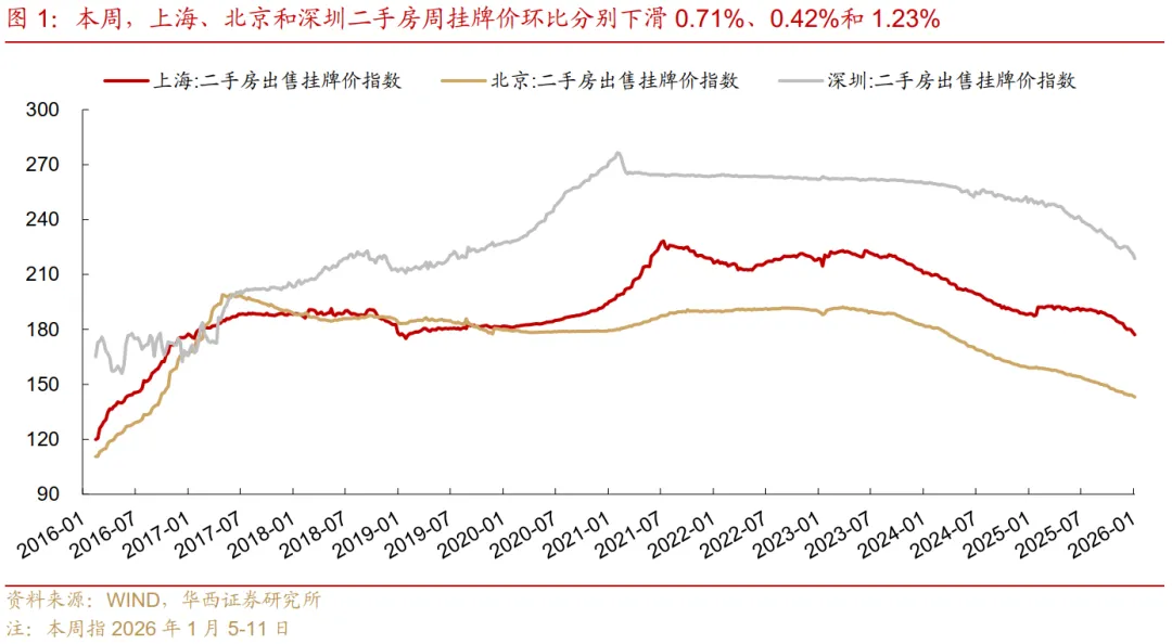 我们主要观察二手房价,因新房价格受推盘区域影响,波动往往较大。本周更新的是Wind披露的二手房出售挂牌价指数(周度)。