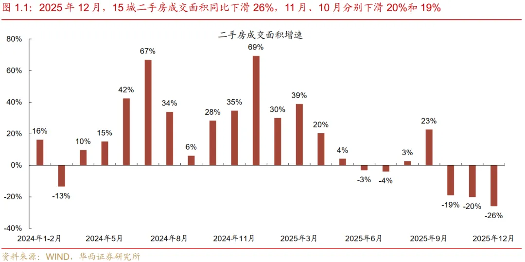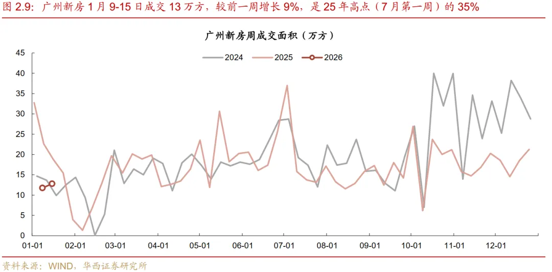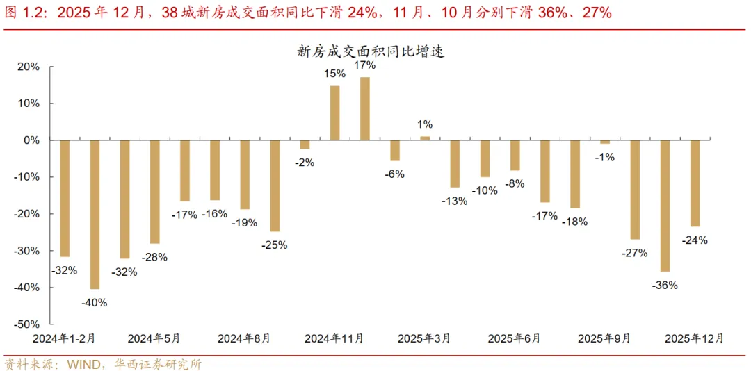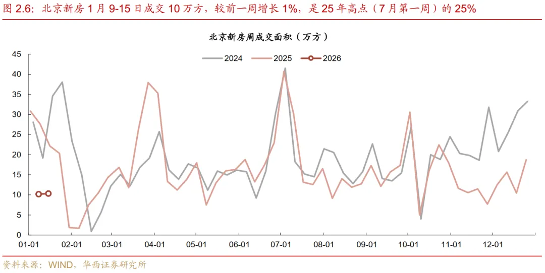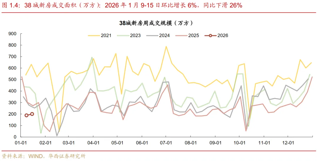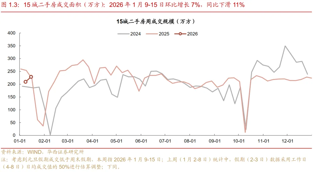 新房市场呈现低位企稳态势,同比降幅有所收敛。经历了上周季节性回调后,本周新房市场出现止跌迹象。本周38城新房成交面积录得200万平,环比小幅回升6%,不过当前成交量尚未恢复至12月的263万-524万平区间。同比维度上,本周新房成交下滑26%,相较于元旦后首周36%的下滑幅度明显收窄,与12月全月24%的降幅相当。需注意的是,新房成交连续十六周呈现同比负增长态势,筑底过程仍在延续。