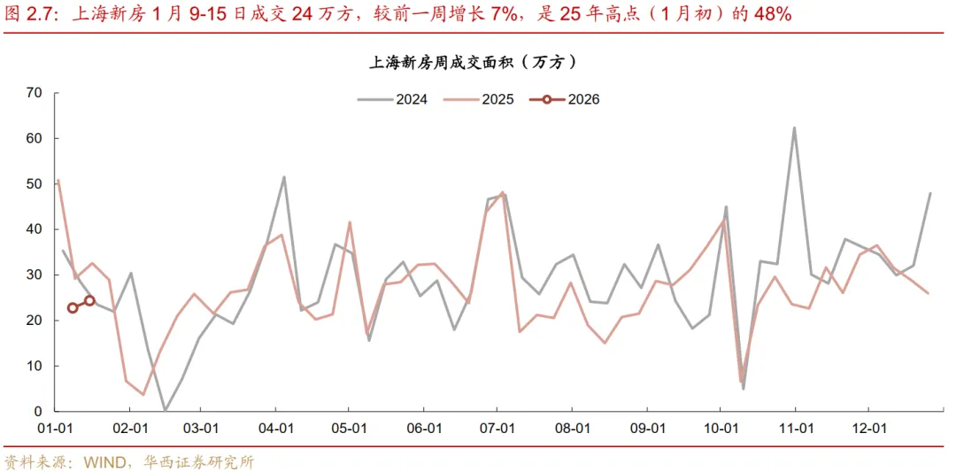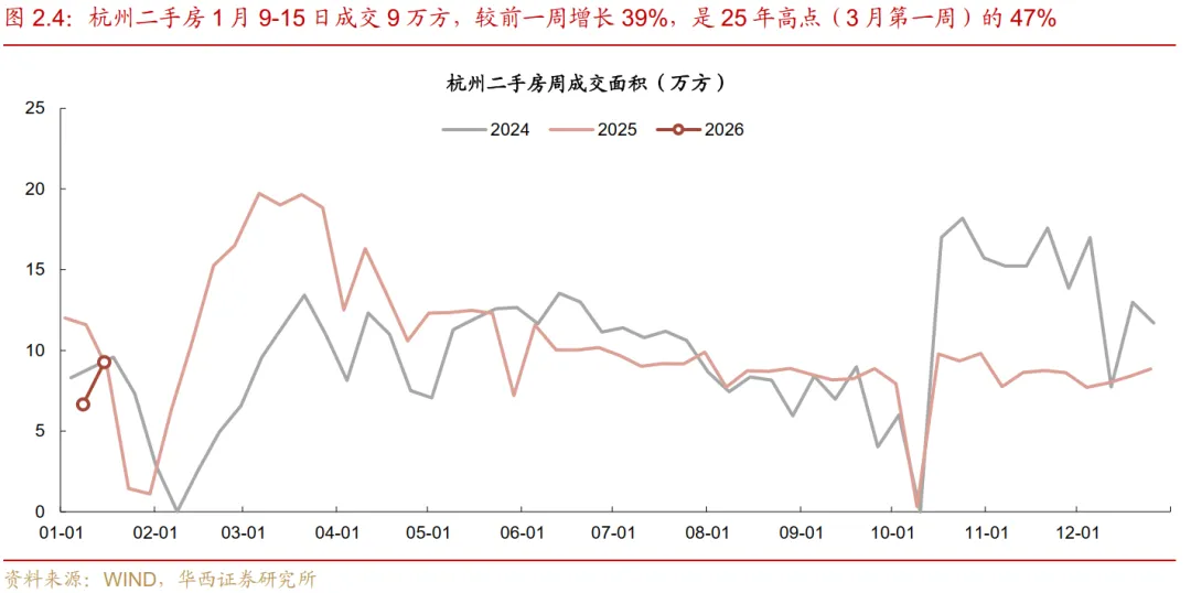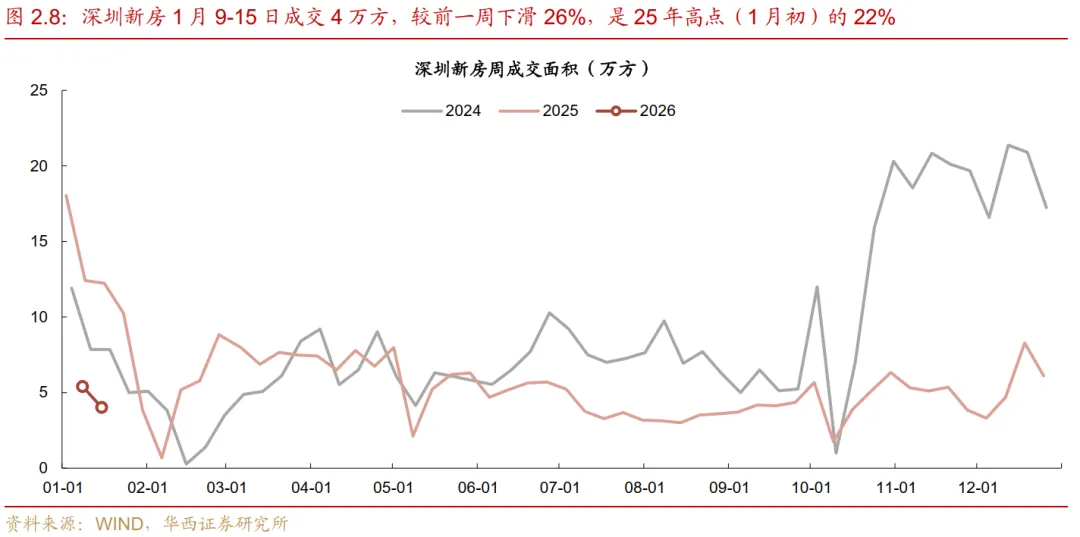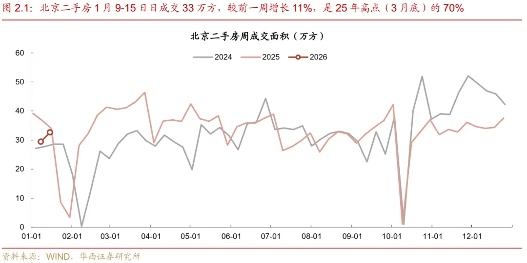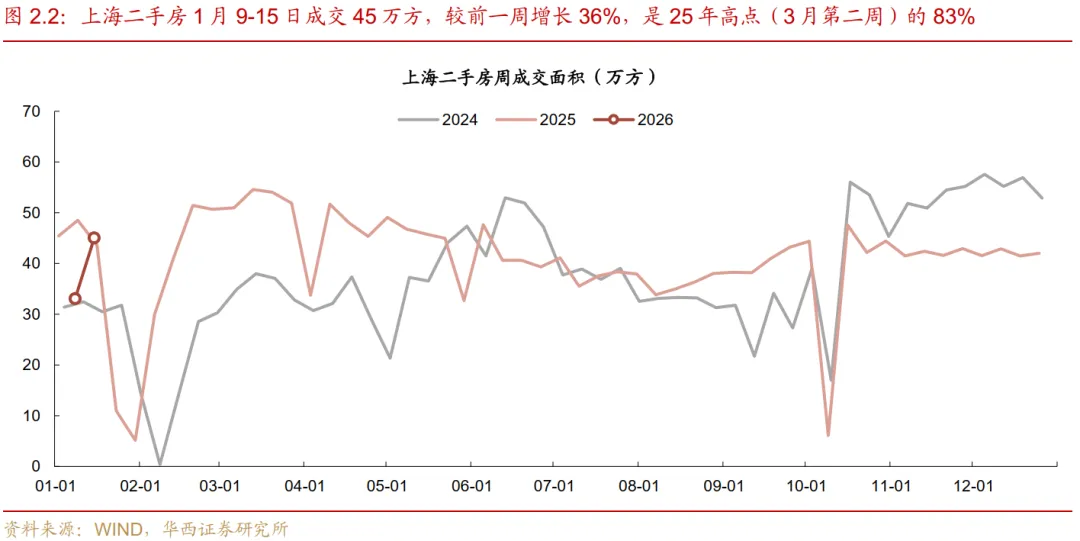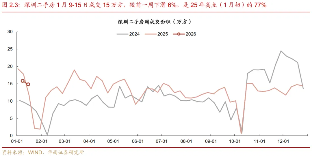 二手房市场修复弹性更大,规模迅速回归至去年12月水平。京沪深三城本周二手房合计成交环比增长18%,绝对量恢复至2025年成交高点的81%,与12月周均成交水平基本持平。城市间表现显著分化,其中上海和北京环比分别增长36%和11%,成交量分别恢复至2025年高点的83%和70%;反观深圳,本周成交环比小幅下滑6%,但绝对量仍保持在2025年高点的77%。同比来看,三城均维持负增长态势,其中上海跌幅最小,同比下滑7%,北京和深圳则分别下滑12%和20%。