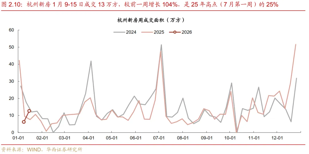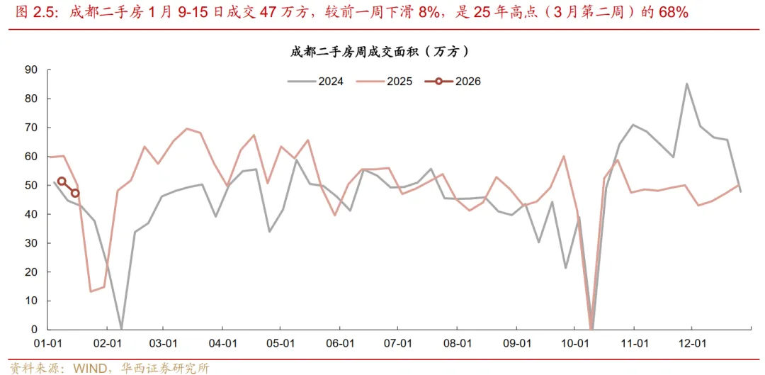 二线城市新房市场呈现弱势企稳态势,内部表现分化显著。新房方面,本周二线城市新房成交环比小幅增长1%,但同比降幅仍达23%。分城市观测,各区域间表现差异较大,前期调整较深的杭州和武汉迎来低位回暖,环比分别录得104%和64%的大幅增长;而青岛和苏州则出现回调,环比跌幅均在40%左右。二手房方面,整体成交呈现小幅波动,环比录得5%的下滑,当前成交规模处于2025年高点的68%,同比降幅为15%。其中杭州二手房成交环比大幅增长39%,厦门和南宁也均实现12%的环比增幅。