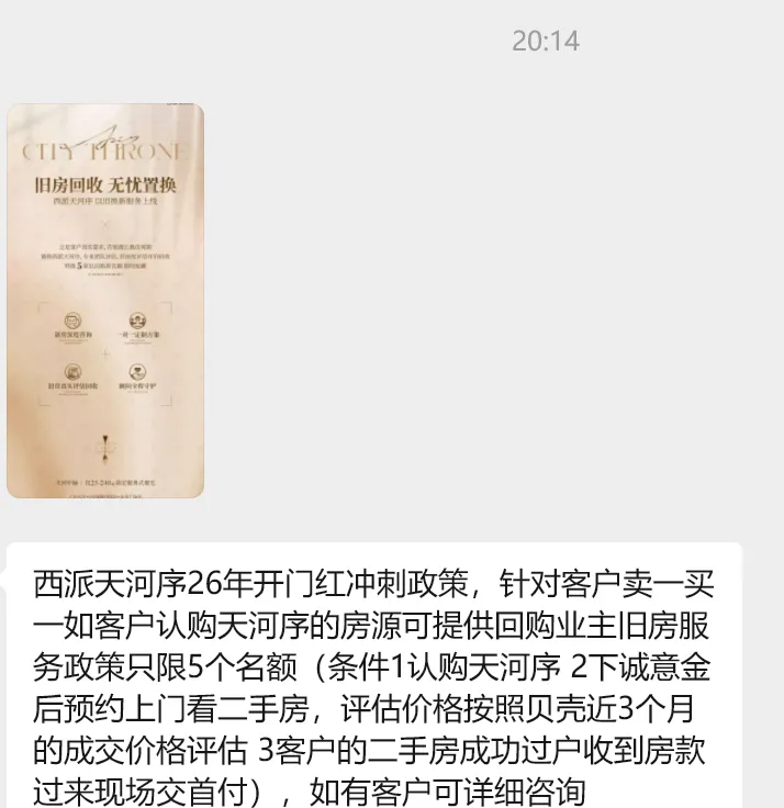 要知道前两年开发商搞 “二手房帮卖”,还得签了新房认购才给推,能不能卖掉全看天意。现在西派天河序直接跳过帮卖,上手就回收,说白了就是想帮买家扫清 “旧房难脱手” 的障碍,好让他们安心买新房。可这政策越贴心,越暴露楼盘的销售焦虑。
