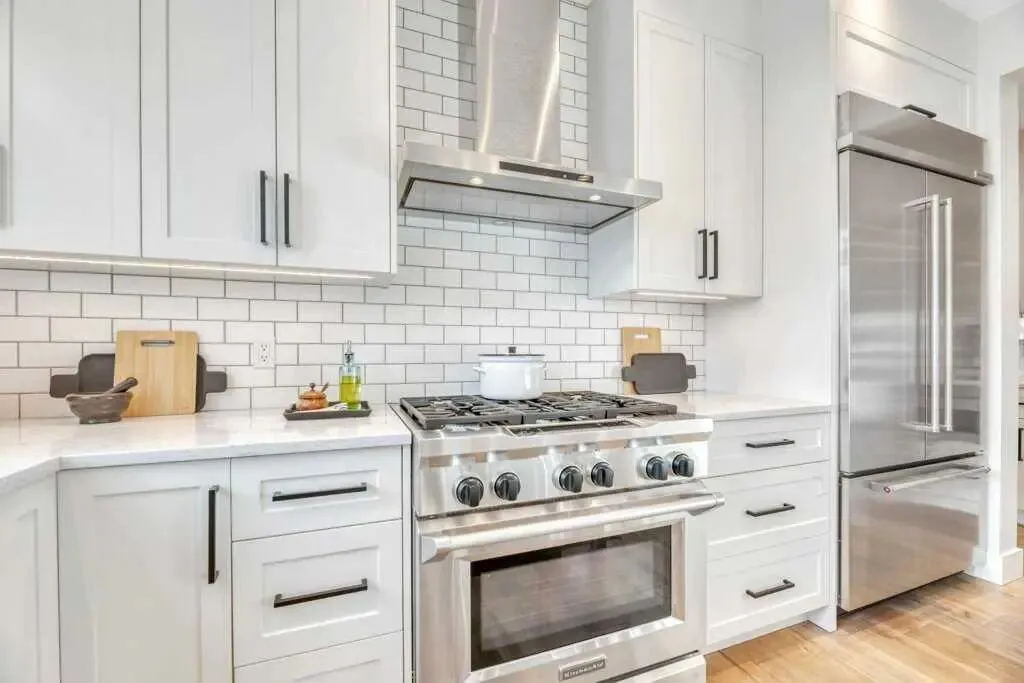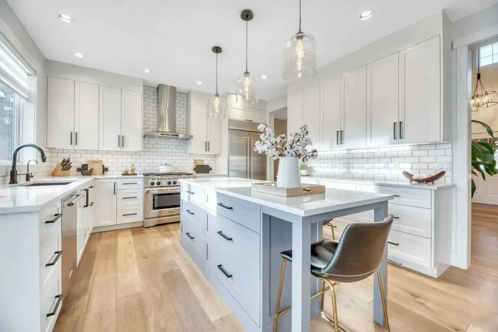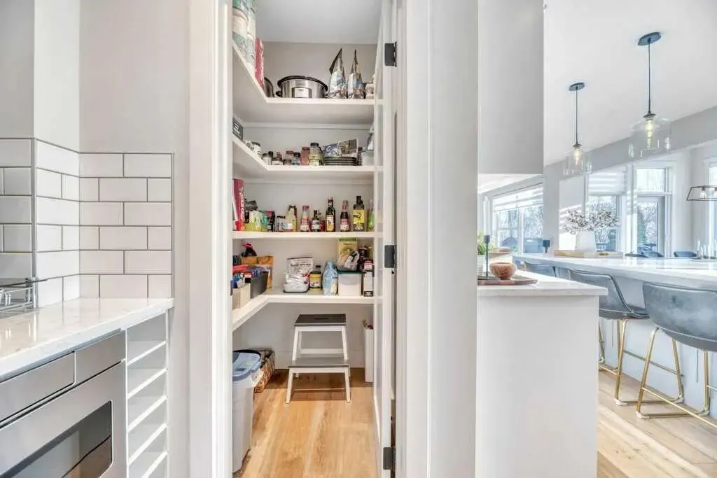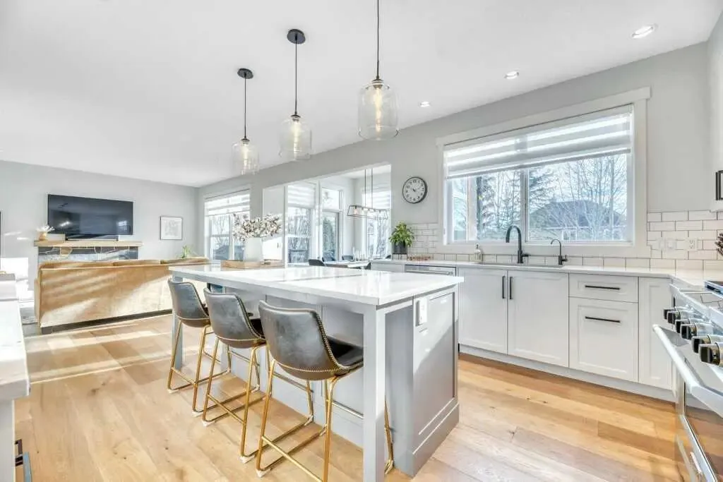 主层空间:尽显奢华 步入室内,约 2,767 平方英尺 的宽敞布局让人眼前一亮。全屋铺设了质感厚实的高级实木复合地板,挑高的天花板配合通透的采光,让整体空间显得格外明亮。设计师厨房是家中的核心,配有 KitchenAid 商业级家电和高端石英石台面。特别值得一提的是,这里还设有一个精致的“管家房”(Butler’s pantry),内置微波炉和第二台冰箱,无论是承办家庭聚会还是日常收纳,都能应对自如。
