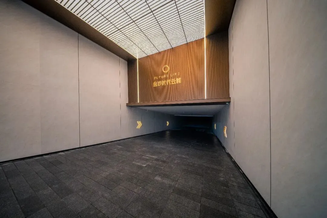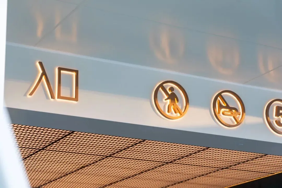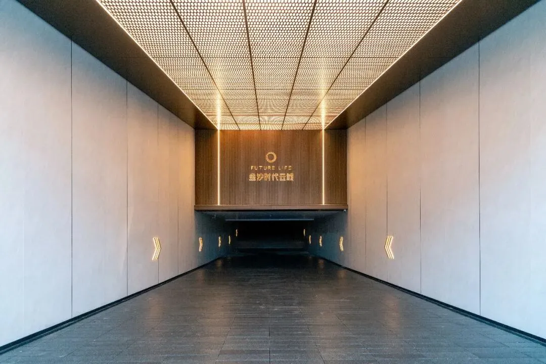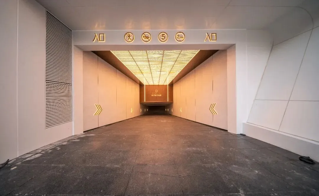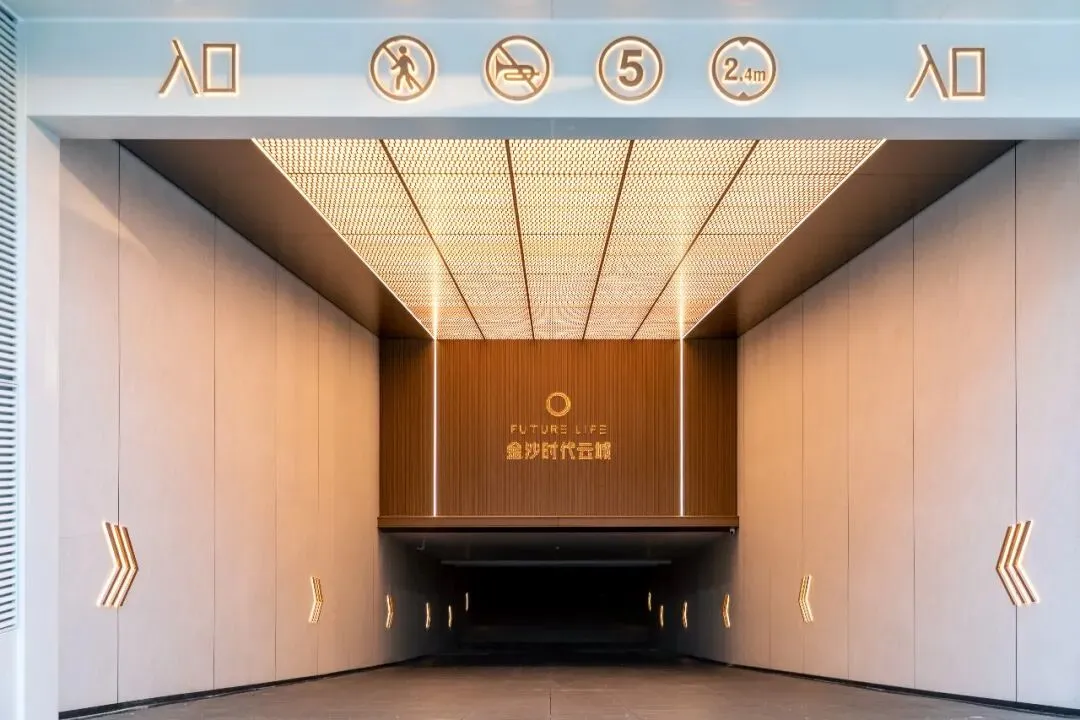 这种“净”,是为了突出尽头的“景”。 在坡道正对面的视觉落点,金属长城板以竖向的线条肌理构建出挺拔的秩序感,承载着悬浮发光字。纯净的墙面做底,精致的金属做骨,主次分明中,拉开了归家的仪式大幕。