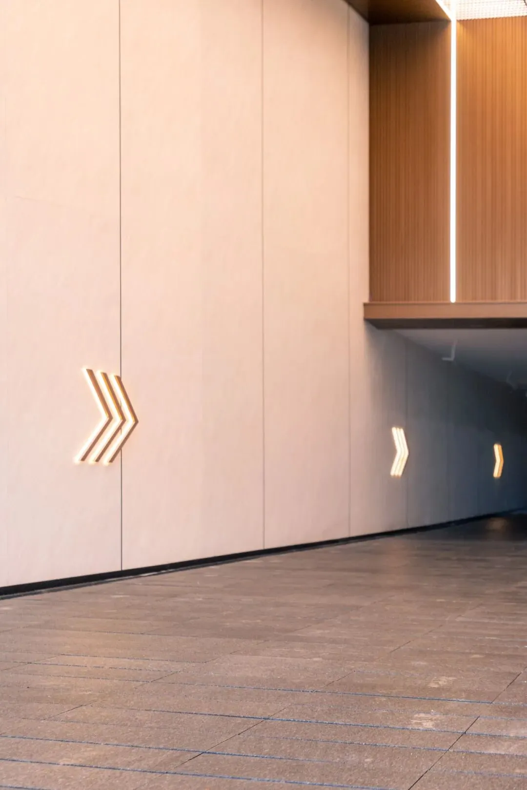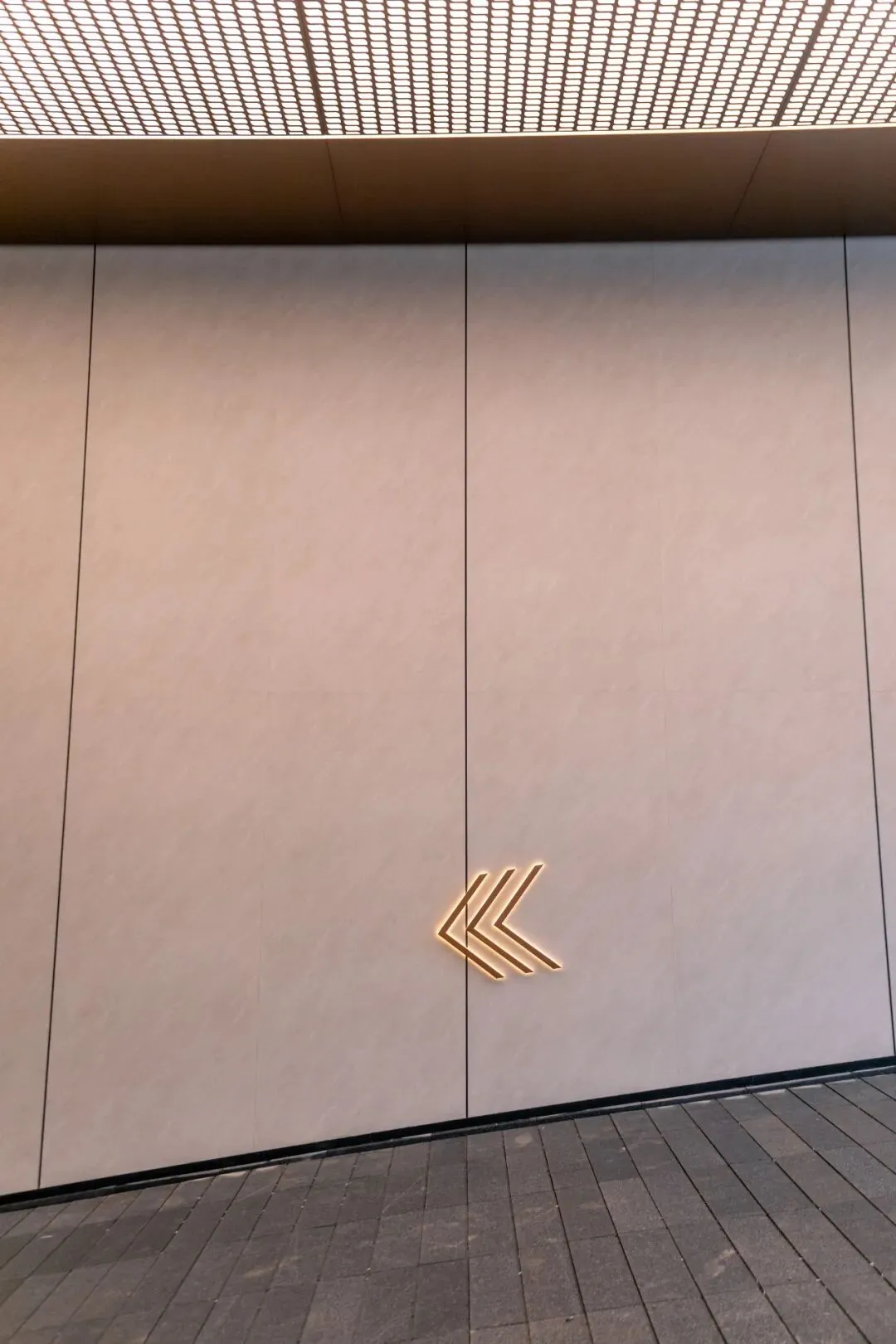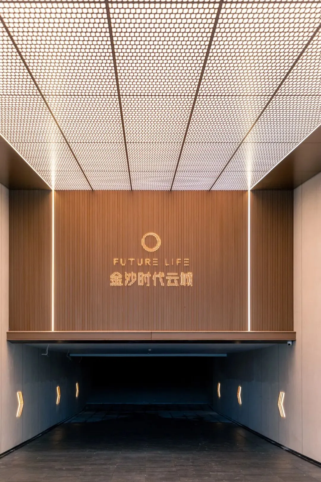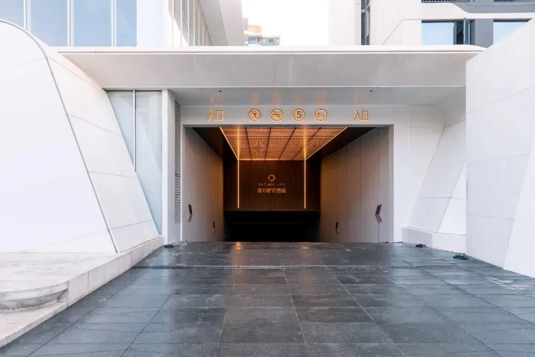这种“净”,是为了突出尽头的“景”。 在坡道正对面的视觉落点,金属长城板以竖向的线条肌理构建出挺拔的秩序感,承载着悬浮发光字。纯净的墙面做底,精致的金属做骨,主次分明中,拉开了归家的仪式大幕。