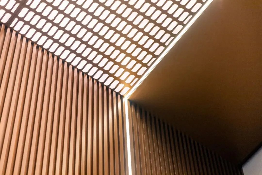 为了避免进出地下车库时因光线剧变造成的瞬间致盲感,顶部设计采用了穿孔铝板结合局部星空顶。穿孔铝板如同一层柔光滤镜,让光线漫反射而下,营造出“见光不见灯”的温润氛围。